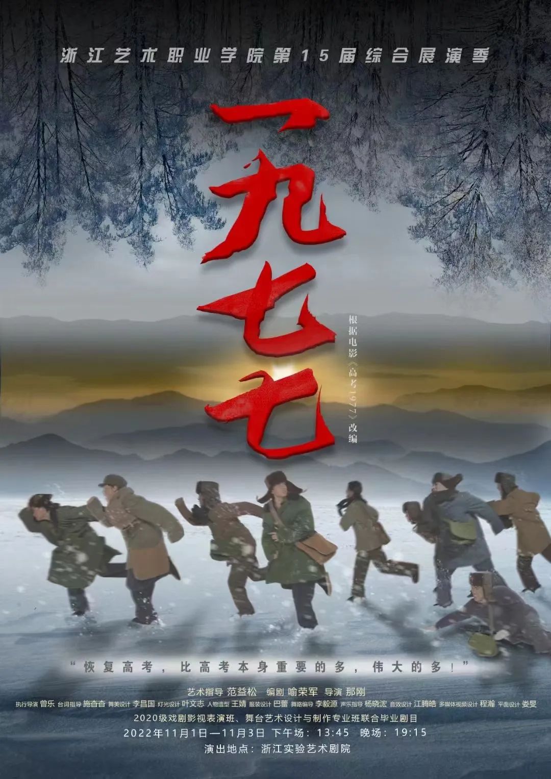 我院始终秉持理论与实践并重的教育理念,坚持全面深化产教融合,打造校企合作新模式,为学生提供更多从课堂“走出去”的机会。11月12日,话剧《1977》将于嘉兴大剧院进行公演,继续将那份对理想的坚守,为公平和正义而不去奋斗的精神,传递给更多的观众。