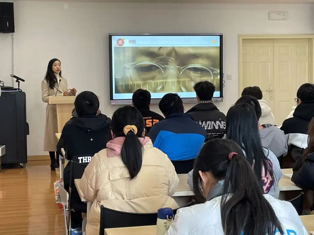 讲座伊始,邱奕雯以“电影艺术”为切入点,讲述了画面构成的要素,围绕“景别”的概念,以主旋律电影《我和我的祖国》为例,讲解了景别运用的重要性。她从画面中主体范围和视觉距离变化两方面区分了远景、全景、中景、近景、特写,以图片和视频相结合的方式直观展现学习重点,深入浅出的教学方式帮助同学们能够更好地理解抽象概念。