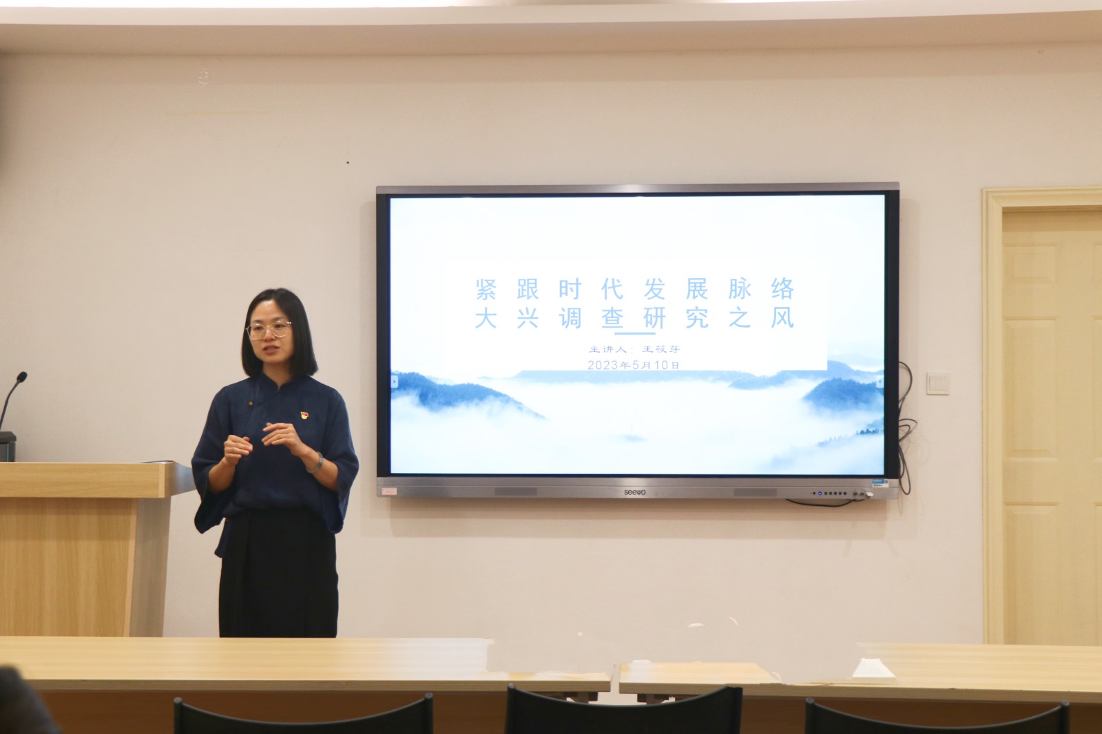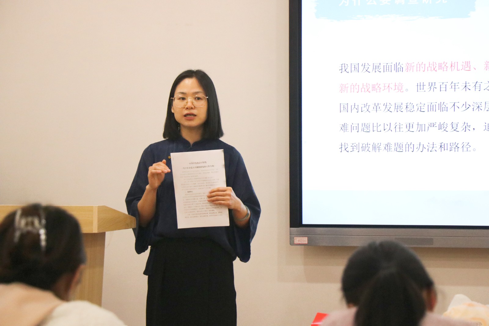 调查研究是谋事之基、成事之道。在面临新的战略机遇、战略环境、战略变局下,大兴调查研究是应对新时代新征程前进路上的风浪考验、推进中国式现代化的有力举措和必然要求。王筱芽从“赤壁之战”“王安石变法”“田野课堂”等案例引入,由古至今、正反面案例结合强调调查研究要突出重点、直击要害,结合实际确定调研内容,让调查研究真正取得实效,调研成果惠及更多群众。