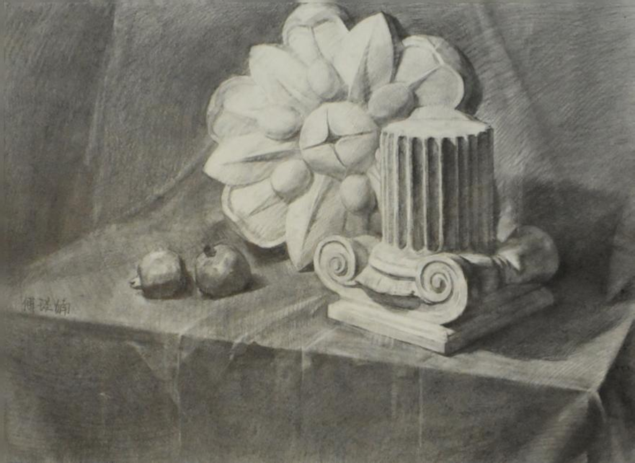 2022级中专绘画班开设有素描静物、素描石膏、素描头像、色彩静物、速写、美术欣赏等专业课程。教师们鼓励学生用个性化的语言来表达他们所观察到的对象,培养他们的感性思维能力。通过专业课程学习,学生能够初步运用理性思维观察对象。在绘画专业学习中,培养学生的理性思维能力是重点。为此,造型基础教研室的教师们严格有效地分阶段研究自然万物存在的视觉基本形式——形体、结构、空间、质感等,帮助学生厘清基本概念,养成正确的观察方法,学会基本写生技巧,培养基础造型能力。