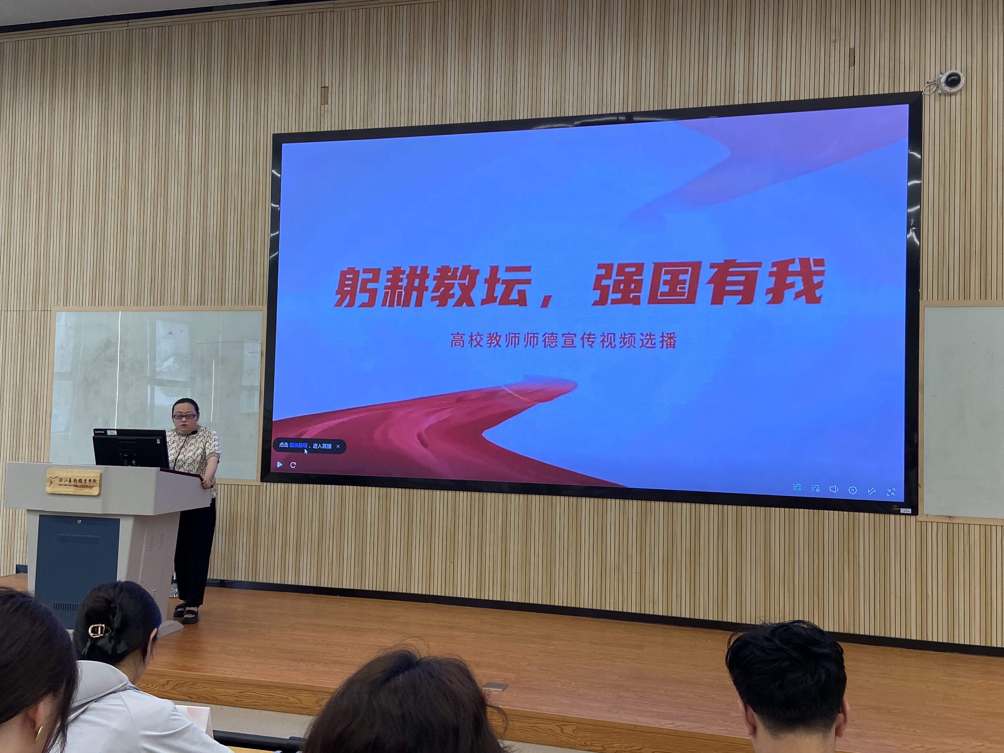9月6日,根据省教育厅通知要求,我校参加浙江省高校新教师培训第一课暨黄大年式教师团队宣讲活动,其中65位新教师在阶梯一教室参加线下观摩,其余教师由各教学单位组织线上观摩。人事处(教师工作部)副处长何颖斐作线下动员讲话。