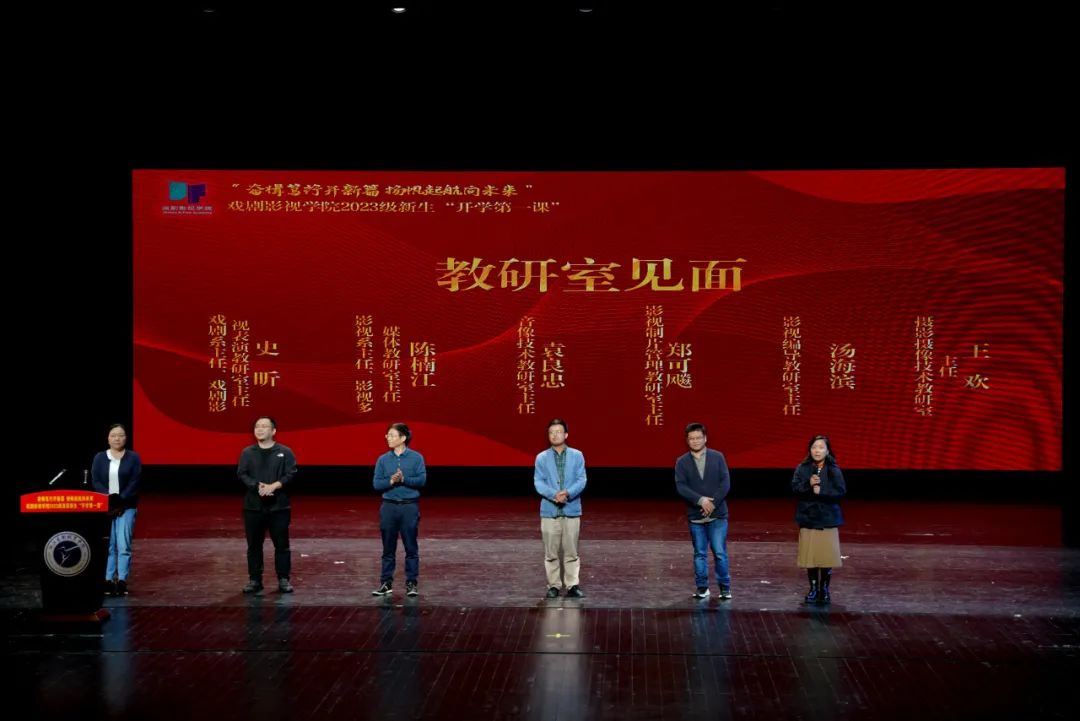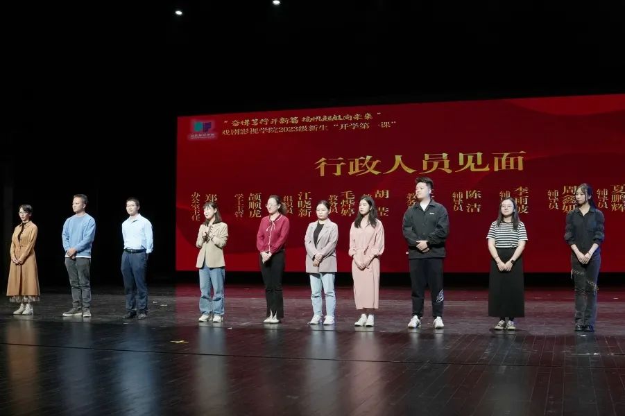 各教研室主任、行政教辅人员上台与新生们见面,依次讲解专业方向与工作范畴,并寄语新生,希望新生们能在戏剧影视学院勇立潮头,展现青春风采,做新时代的戏影追梦人。