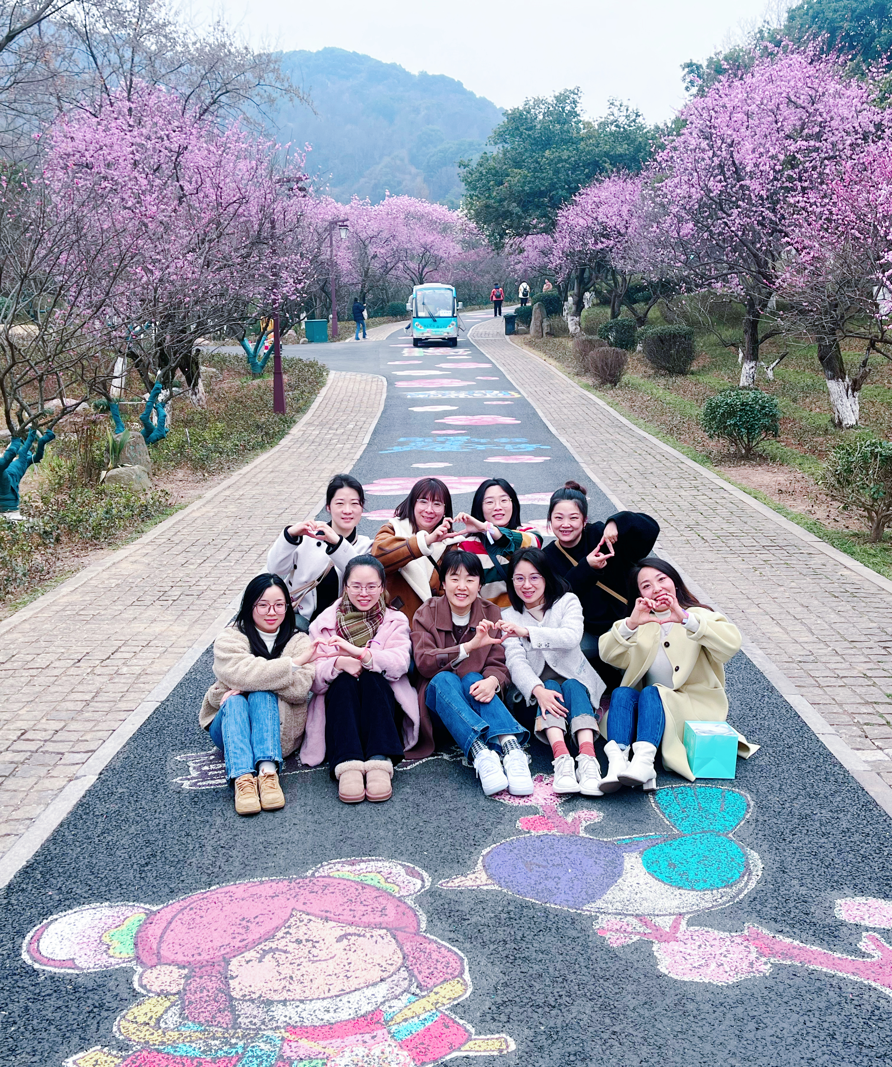 踏入超山风景名胜区,大家坐上观光车,沿陡坡向上而行,两边不时擦过星星点点的梅花,走上梅花大道,路上涂鸦的文艺字体与梅花,成为沿途一抹亮丽的风景。大家沉醉其中,或拿出手机拍摄两边秀丽风景,或不语放空享受难得的悠哉。观光车靠站,大家一边徜徉一边寻找唐梅与宋梅。她们踏春寻梅,漫步堤岸,赏花,洽谈,拍照,卸下一切疲惫与烦恼,去拥抱、感受自然的气息。