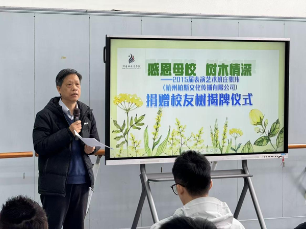 演教学院党总支书记戴闵青向出席本次活动的领导、嘉宾及师生表示热烈欢迎,详细介绍了学校教育发展基金会的建设发展情况,并对庄骐玮心系母校、反哺育人的善举致以诚挚谢意。她表示,庄骐玮以企业名义为母校70周年校庆捐赠五千元认捐校友树,将对母校的深情厚谊化作实际行动,充分彰显了浙艺校友的使命担当。