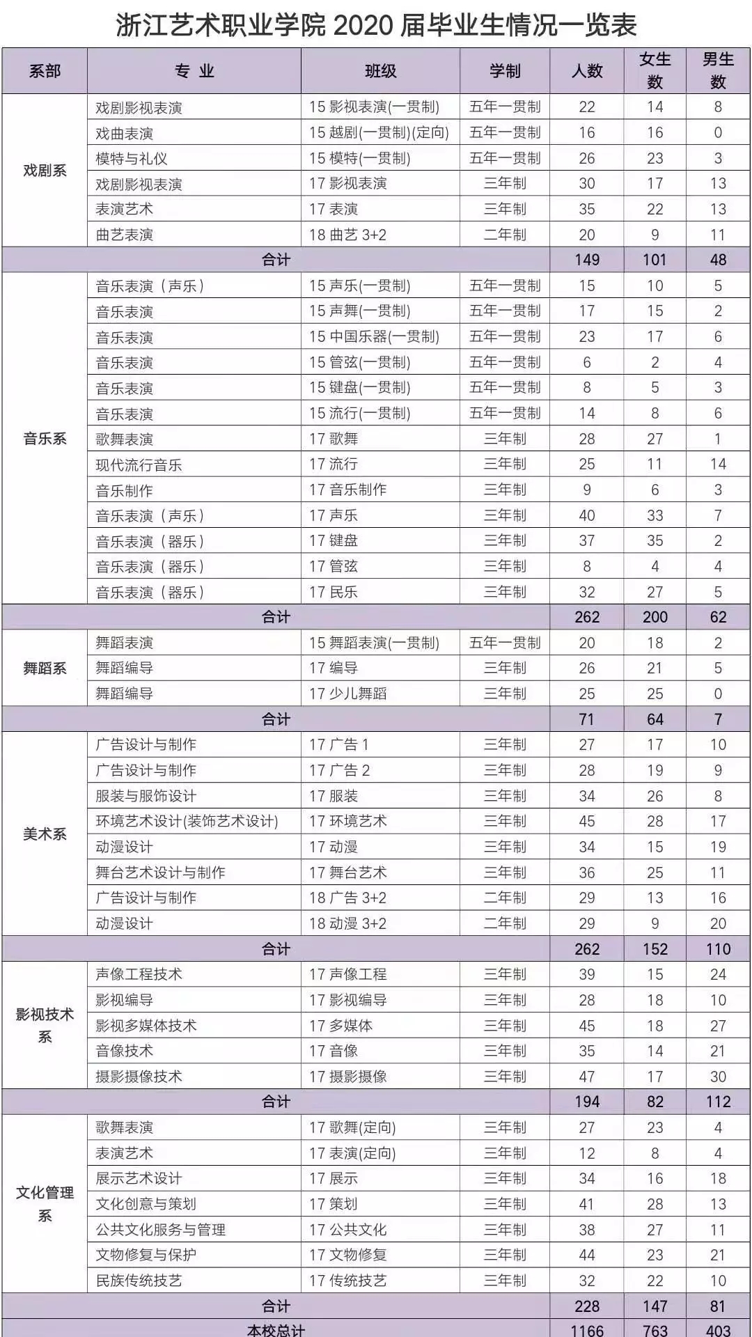 附表1: 浙江艺术职业学院2020届毕业生情况一览表