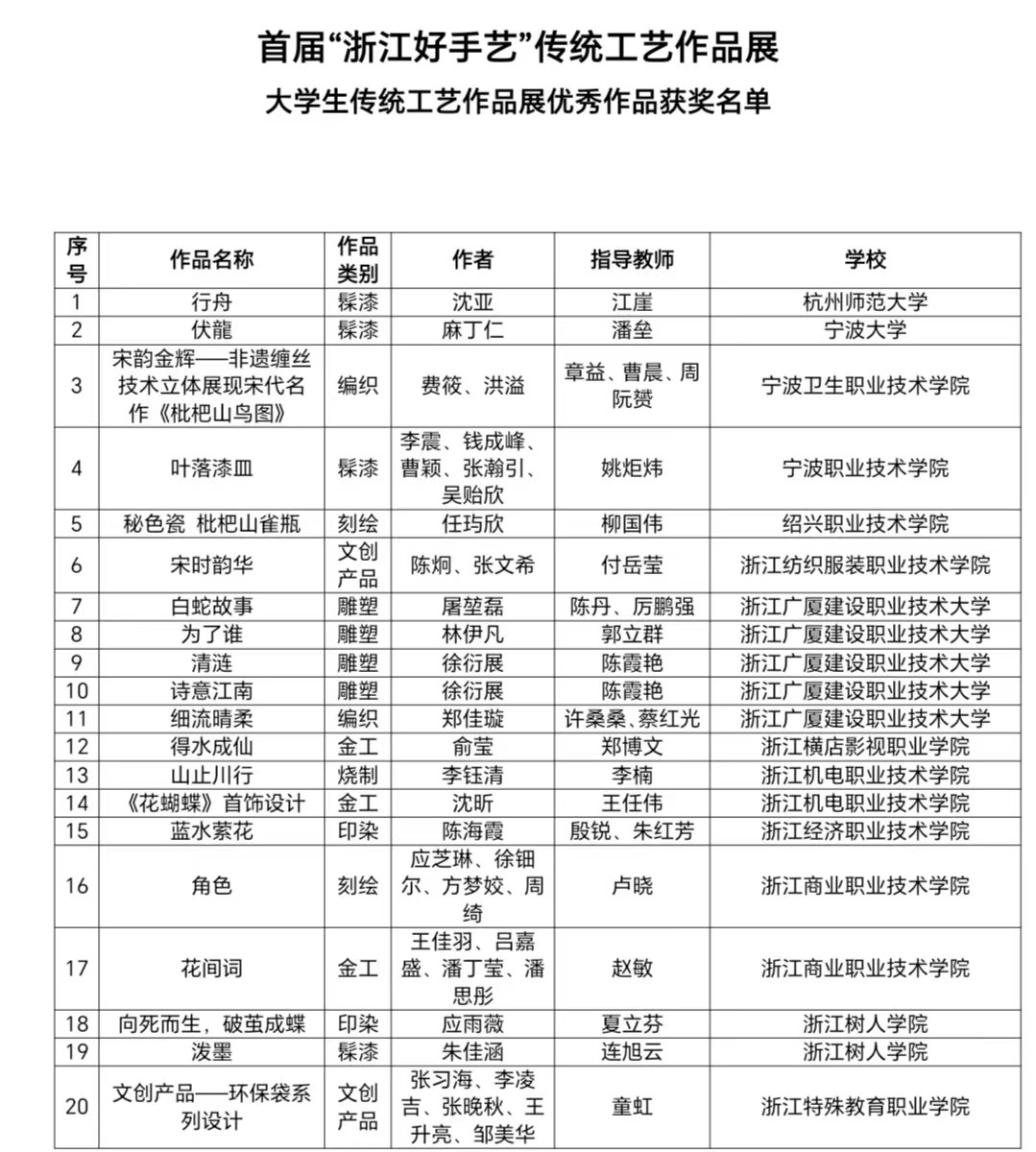 由浙江省文化和旅游厅、浙江省教育厅指导,浙江省文化艺术类职业教育行业指导委员会、浙江艺术职业学院主办的首届“浙江好手艺”传统工艺作品展——大学生传统工艺作品展已于近日圆满完成终评专家评鉴工作,共评选出优秀作品奖46项和优秀组织院校奖12项,现予以公布,详细获奖名单见附件。