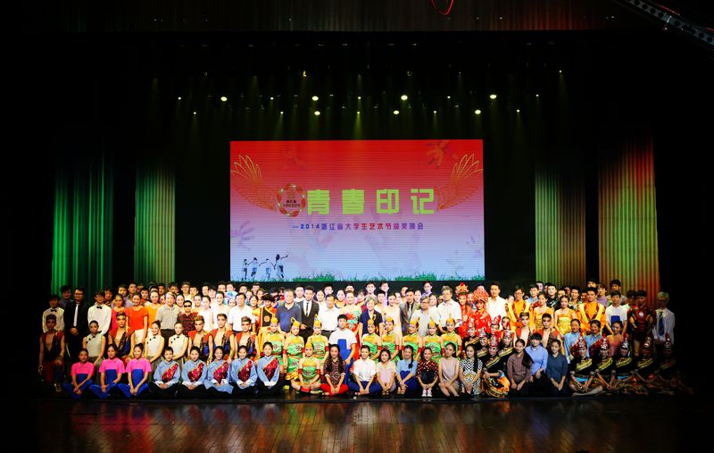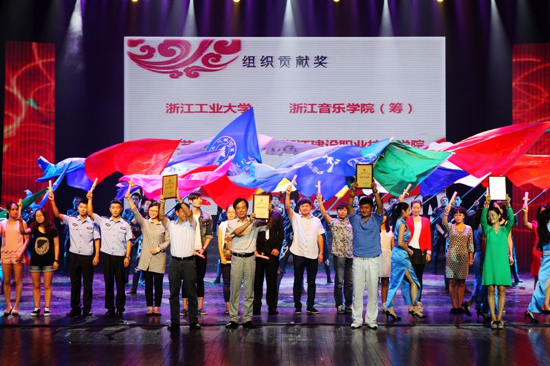 传承民族精神,共筑青春梦想。经过为期7天的现场展演,9月27日晚,2014年浙江省大学生艺术节在浙江艺术职业学院浙江实验艺术剧场圆满落下帷幕。作为全省规模最大的大学生艺术盛会,全省高校学子用自己的方式,在舞台上尽情演绎青春梦想。展演期间,来自全省高校的3000多名师生,用声乐、器乐、舞蹈、戏剧等丰富多彩的艺术形式展现青春风采,弘扬时代精神,用艺术传递青春正能量。原省政协副主席盛昌黎,省委教育工委副书记、省教育厅副厅长鲍学军,省文化厅副厅长、浙江音乐学院(筹)党委书记诸子育,省文化厅副厅长柳河,省文联书记处书记黄先钢,浙江艺术职业学院党委书记林国荣等领导出席艺术节闭幕式暨颁奖晚会。