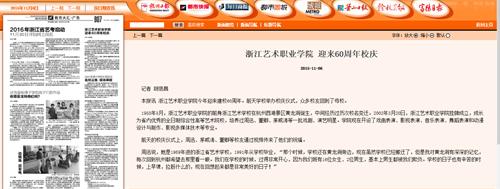 11月4日,浙江艺术职业学院举办建校60周年校庆大会暨纪念演出,浙江卫视、中国文化报、中国教育报、钱江晚报、杭州日报、都市快报等传统媒体,和浙江在线、新浪浙江、腾讯大浙网、浙江新闻客户端、杭州网等新媒体都进行了相关报道,向社会各界传递了浙艺办学理念、特色、最新成果及明星校友等信息,扩大学院影响,为学院口碑和美誉度添彩。