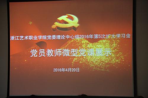 4月20日下午,浙江艺术职业学院党委召开理论中心组2016年第5次扩大学习会。本次学习结合省委教育工委第二届全省高校微型党课大赛和省文化厅“我为高水平全面小康作贡献”大讨论展开,以“十三五话担当 我为浙艺高水平发展作贡献”为主题,来自各系部的7名教师党员在会上进行微型党课主题宣讲,院党政班子和处级干部参加学习会。
