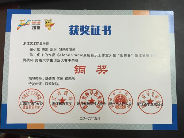 近日,由共青团浙江省委、浙江省教育厅、浙江省科学技术协会、温州市人民政府、浙江省学生联合会主办,温州医科大学承办的浙江省第十届“挑战杯”大学生创业大赛进行了终审决赛,浙江艺术职业学院选送的《Alone Studio原创音乐工作室》创业计划书与众多本科生、研究生作品同台竞技,终获铜奖,实现了我院近年来参加浙江省“挑战杯”大学生创业大赛奖项“零”的突破。