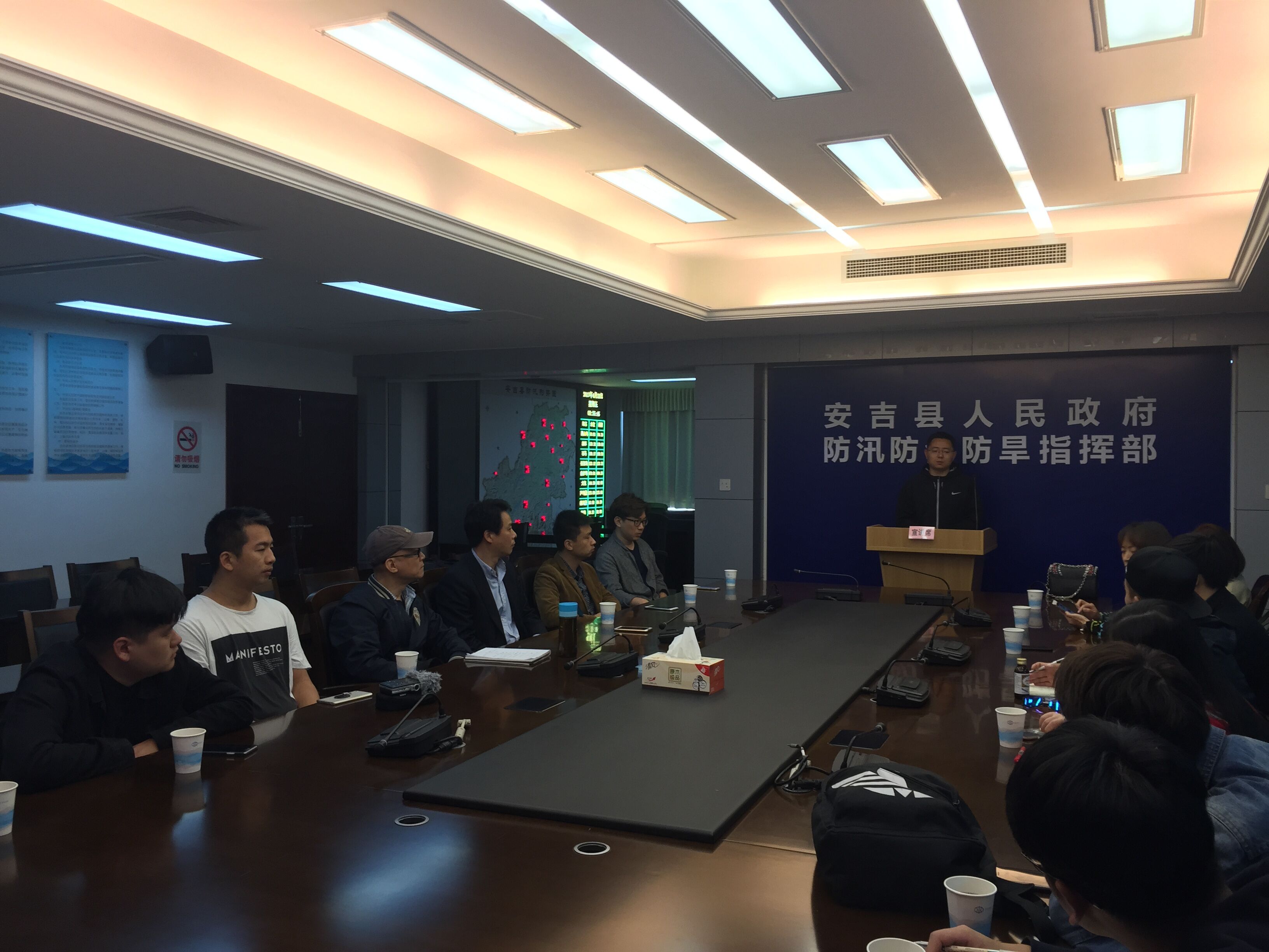 28号上午,采风分队来到安吉县水利局采访治水战线典型人物共产党员谷红卫,现场聆听他的事迹宣讲,观看了人物介绍视频。谷红卫在水利战线全心全意服务三十年,榜样精神诚为可贵,采风队员均为其事迹打动,现场纷纷提问采访,展开讨论。治水一线动情的鲜活事例激发了创作动力,老师们表示,回去将选择素材进行创作,以优秀的新创作品参加巡演活动。