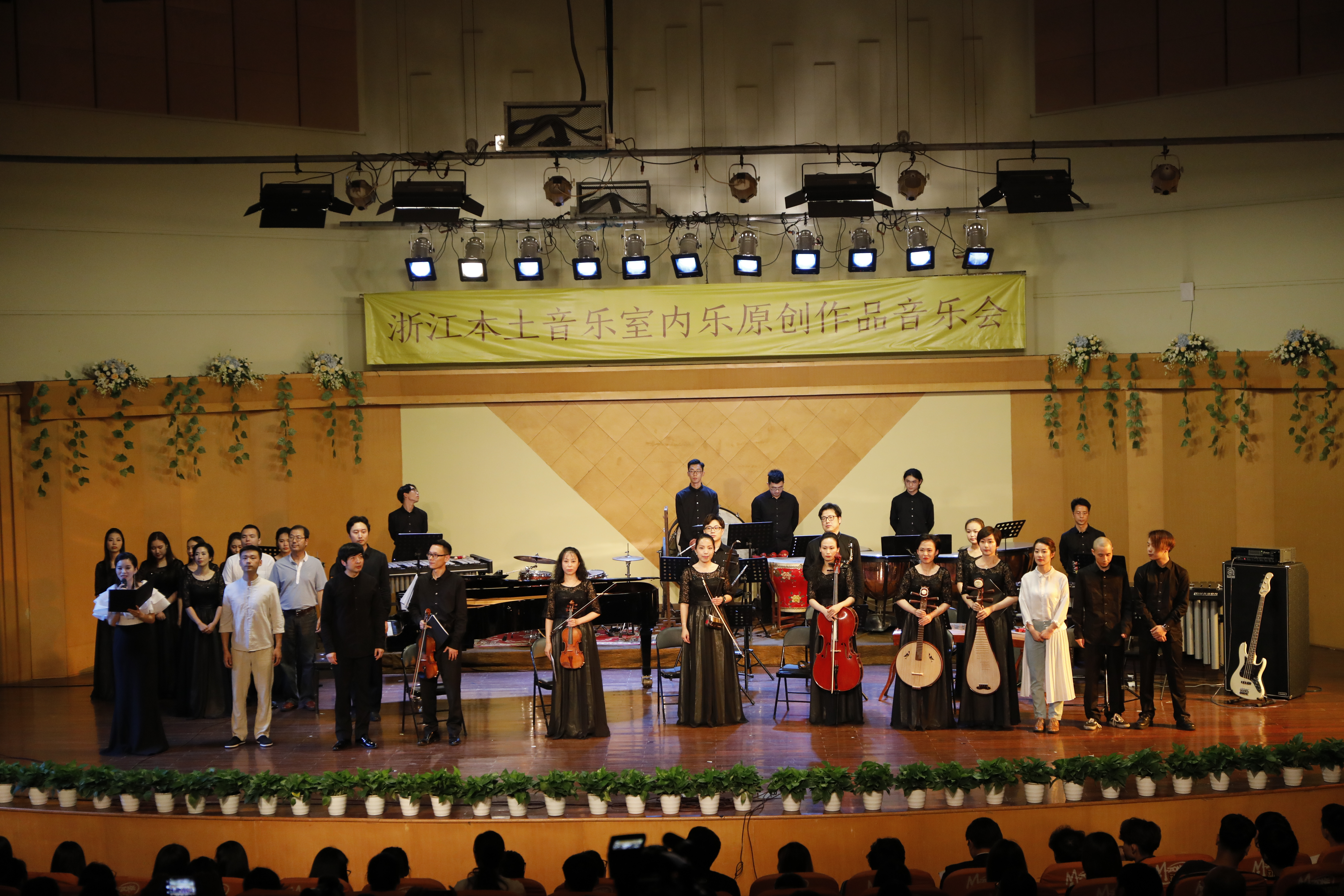 许多人站着听完近90分钟的音乐会。没有赶上昨晚演出的观众还有一次机会。6月9日晚,浙江本土音乐民族管弦乐原创作品音乐会继续在浙艺音乐厅举行。音乐会由浙江艺术职业学院民族管弦乐团演奏。这是一支具有较高演奏水准建制规范的学生民族管弦乐团,由优秀专业教师担任乐团首席及声部指导,着力于“浙江本土音乐原创作品表演、研究与推广”。音乐会第一首民族管弦乐《治水令》由作曲家朱晓谷创作,由“灾”“难”“治”“凯”四部分组成,围绕大禹治水主线一气呵成,表达了五水可治、家园可兴的精神;作曲家王天明的民族室内乐《八婺来风》引用了浙江本土音乐中璀璨的婺剧音乐元素,叙述浙江八婺大地的人文情怀;作曲家周煜国的扬琴协奏曲《咏竹》歌咏的是江南的竹子,颂扬的是中华民族的风骨气节;压轴曲《鉴湖侠女——秋瑾》是何占豪的作品,用音乐讲述秋瑾的故事,“不惜千金买宝刀,貂裘换酒也堪豪。一腔热血勤珍重,洒去犹能化碧涛”,侠女的诗正是巾帼英雄的最好写照。