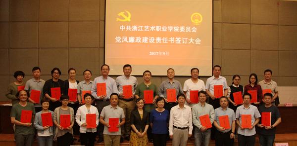 9月28日中午,浙江艺术职业学院党风廉政建设责任书签订大会在图信报告厅举行。党委书记朱海闵,院长、党委副书记黄杭娟与各教学单位、行政部门党政负责人签订了党风廉政建设责任书。党委委员、纪委书记徐芳主持签订仪式。