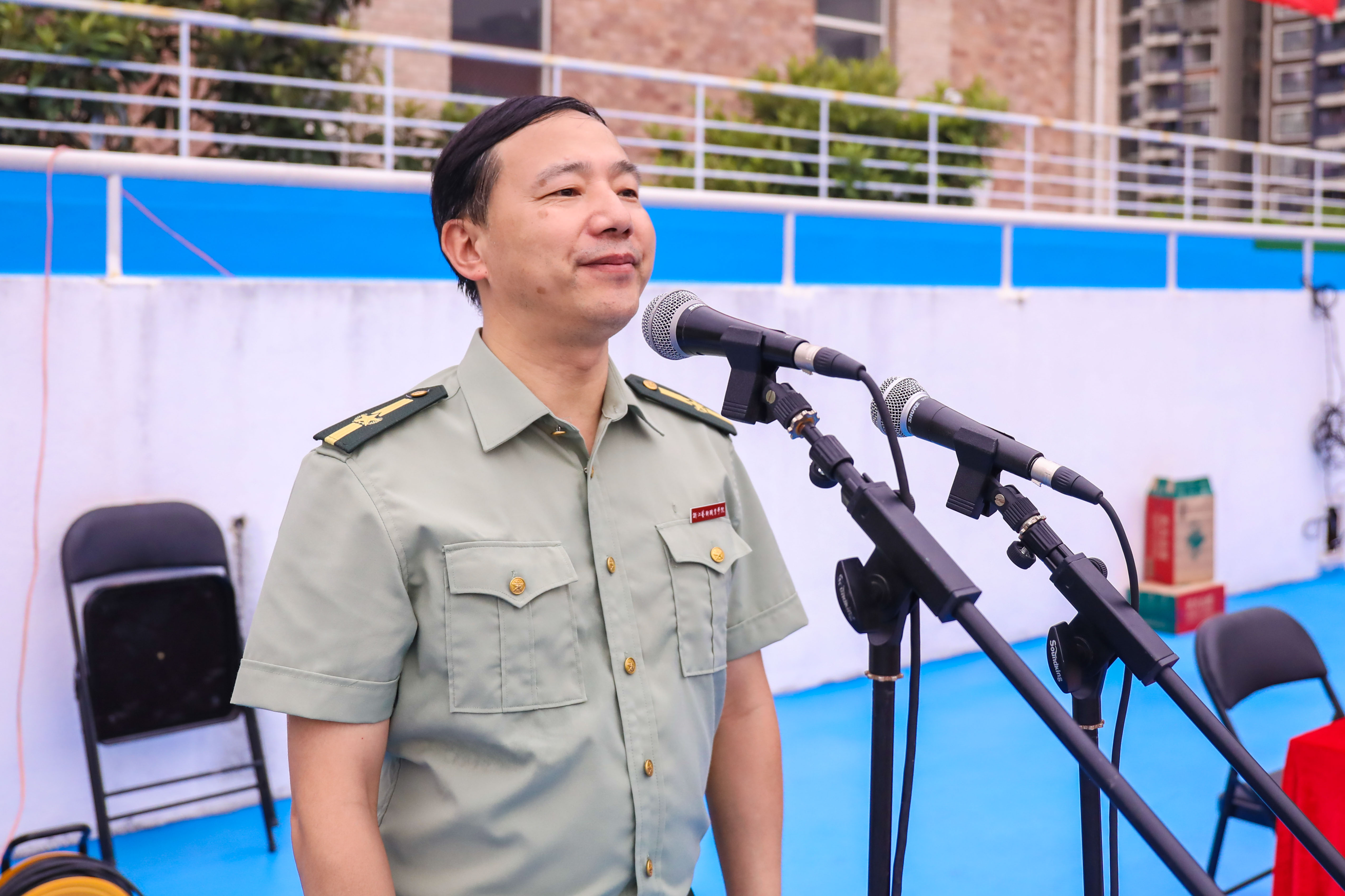 2017级音乐系声乐一贯制班的俞懿珈同学作为新生代表发言:“作为艺术生,我们深知学艺的艰辛和不易,那些年为了追求我们的浙艺梦,我们一句句、一遍遍地反复练习。现在,我们梦想成真,怀着激动和自豪的心情,肩负家长的期望来到浙艺就读,这里将是我们梦想开始的地方,我们将在这里扬帆起航……”她代表所有新生向教官们致以崇高的敬意和深深的感谢。