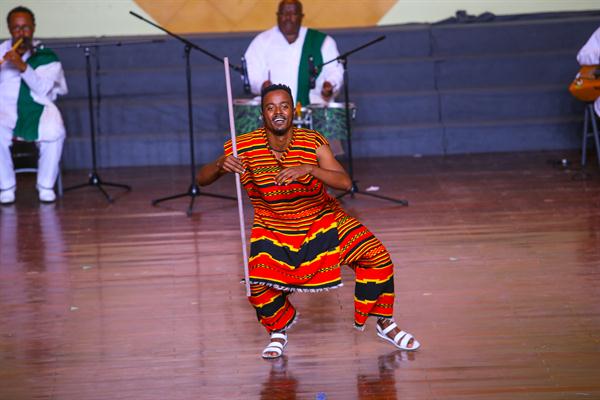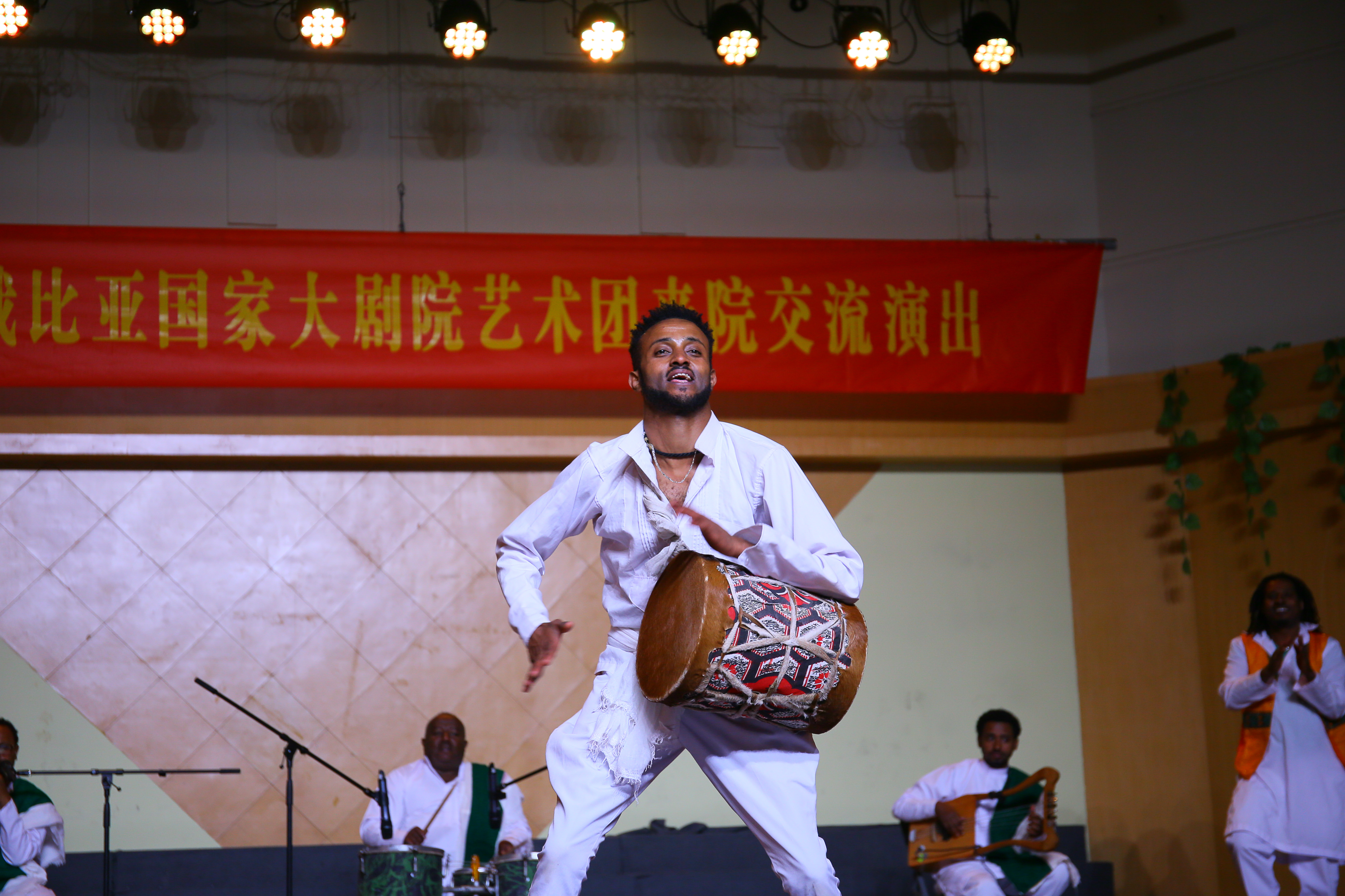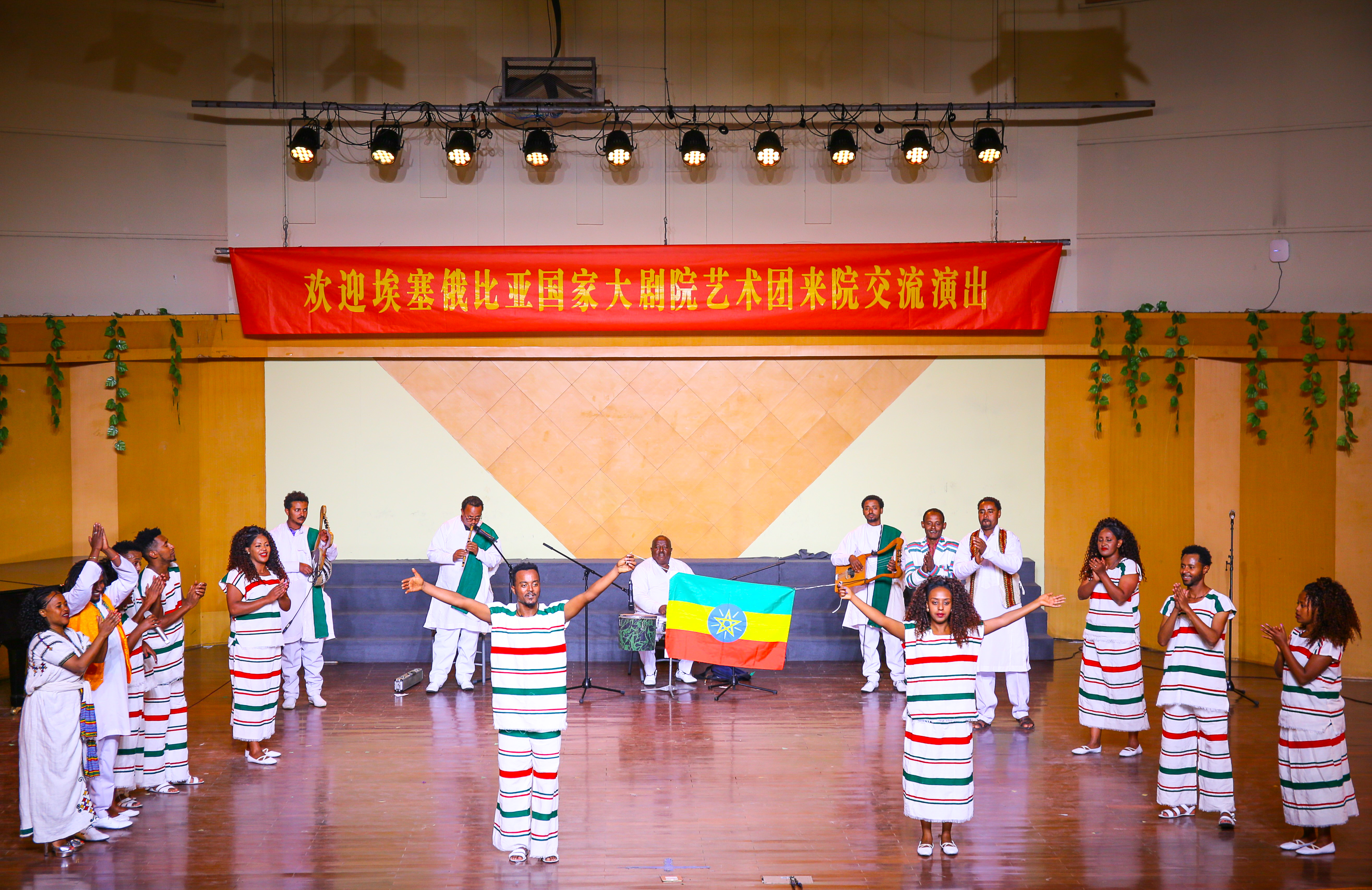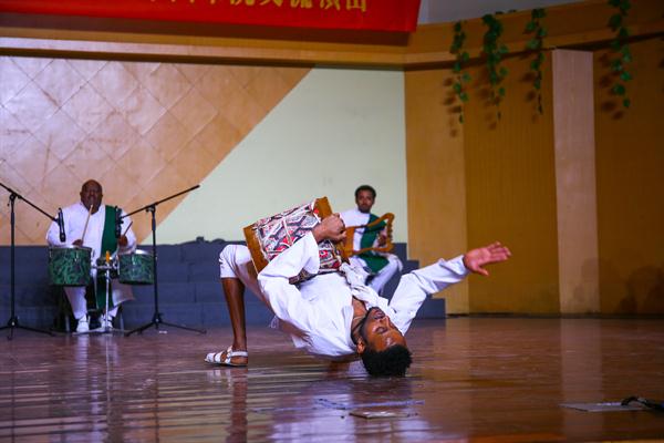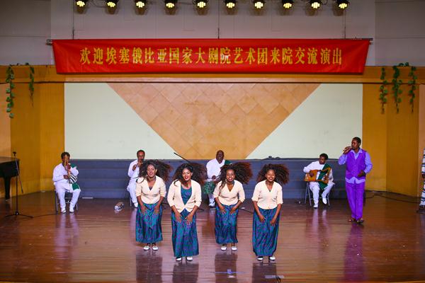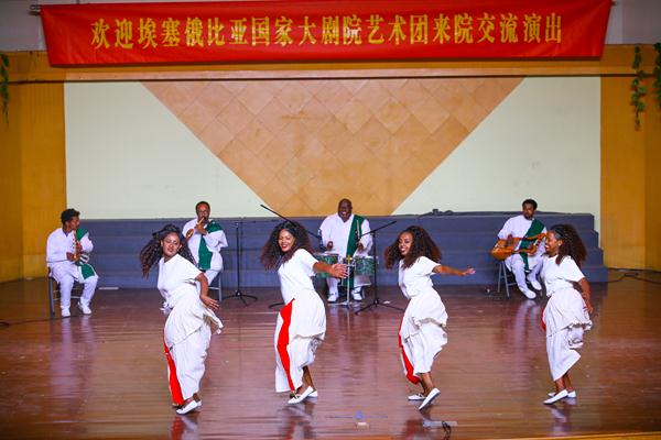 由歌唱家、舞蹈家和演奏家组成的20多位埃塞俄比亚国家剧团成员在我校师生的热烈欢迎和引导下参观了浙艺。戏剧系同学敏捷的身手、舞蹈系同学优美的舞姿、音乐系同学清亮的歌喉以及文管系同学的手工创意作品都令外宾们惊叹不已。埃塞俄比亚剧团在浙艺音乐厅展演了一场富有民族特色又热情洋溢的歌舞剧,整部剧分为几个小剧目,由四种不同的乐器演奏,五个歌手轮流主唱,服饰缤纷靓丽。演员们还带来了特技表演:跳跃打鼓、甩头舞等高难度动作,演员们还邀请浙艺师生与他们结成队伍,一起欢呼,一起谢幕。