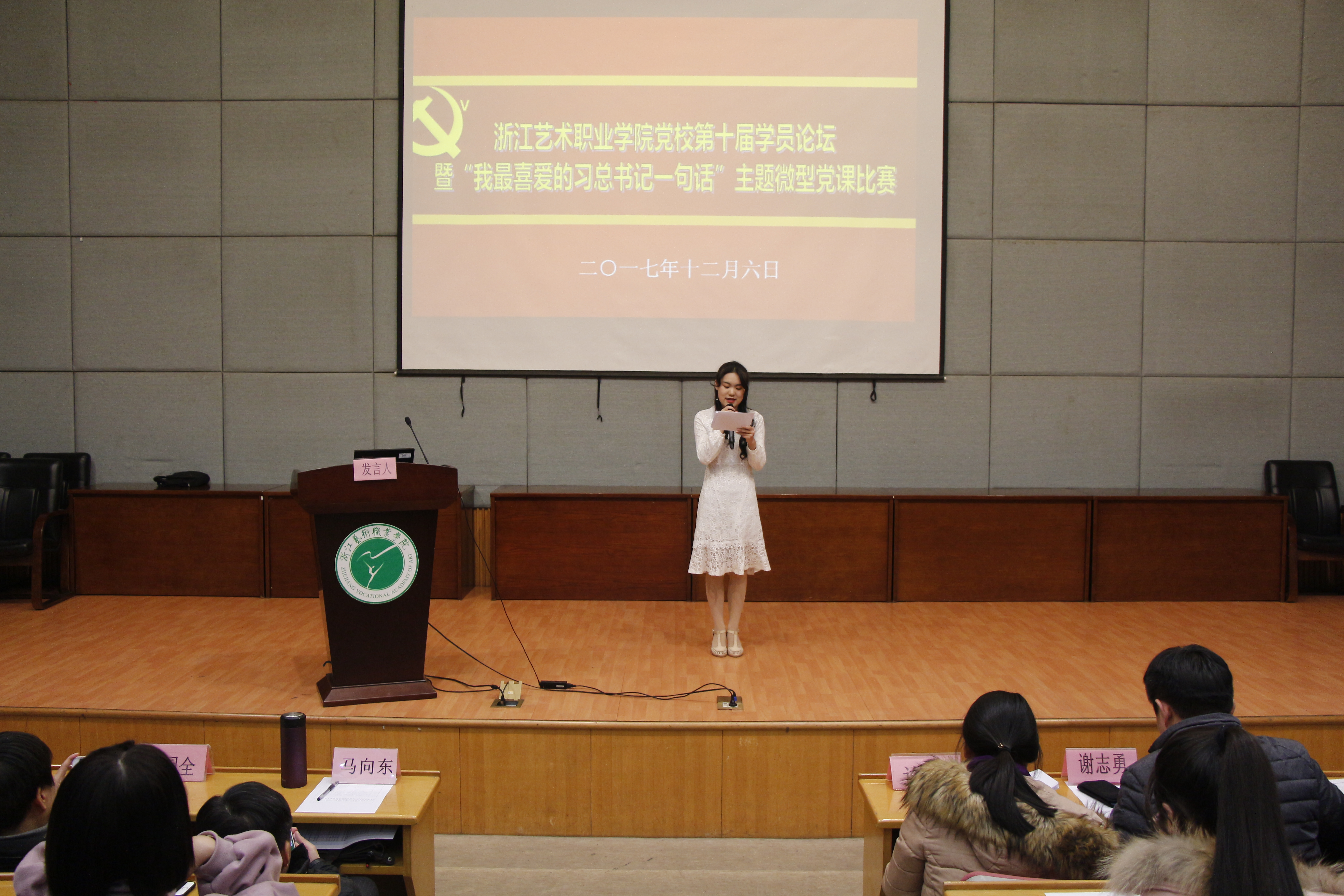 126日晚,浙江艺术职业学院党校第十届学员论坛暨“我最喜爱的习总书记的一句话”主题微型党课比赛在图信中心报告厅举行。这是我校在兴起学习宣传贯彻党的十九大精神热潮之际举办的一次师生共同参与的富有特色和成效的主题教育活动。