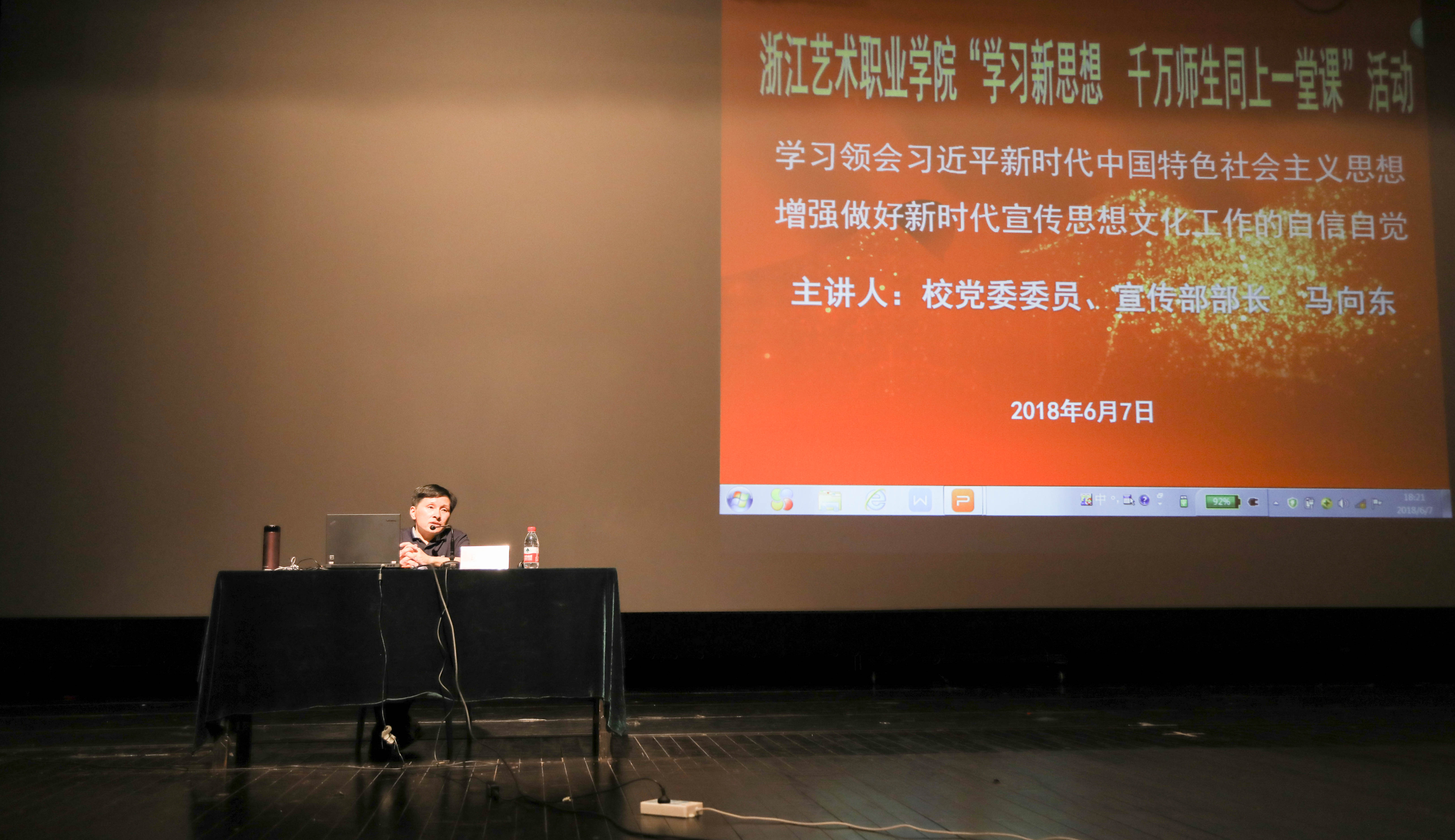 6月7日晚,校党委委员、宣传部部长马向东在浙江实验艺术剧场为全校各系学生开讲。讲座以《学习领会习近平新时代中国特色社会主义思想  增强做好新时代宣传思想文化工作的自信自觉》为题,带领同学们系统学习了习近平新时代中国特色社会主义思想。讲座从新世情需要新方案、新事业需要新指南、新工程需要新引导、新成就需要新总结四个方面介绍了习近平新时代中国特色社会主义思想产生的时代背景。新思想围绕坚持和发展中国特色社会主义,提出了一系列具有开创性意义的新理念新思想新战略,是一个系统完整、逻辑严密的科学理论体系,其主题主线是大梁,“八个明确”是支柱,基本方略是根基,“八个明确”和“十四个坚持”相辅相成,展现了新思想的核心内容和丰富内涵。讲座号召同学们要深入学习领会习近平新时代中国特色社会主义思想关于意识形态和宣传思想文化工作的精神实质,弘扬社会主义核心价值观,增强做好新时代宣传思想文化工作的自信自觉。