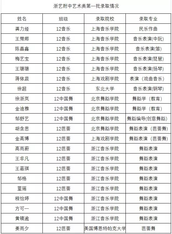 备受关注的2018年艺术类第一批志愿投档结束,我校附中学子高考再创佳绩。20人获艺术类第一批院校录取,1人被国外本科院校录取。另有9人被我校提前招生录取。