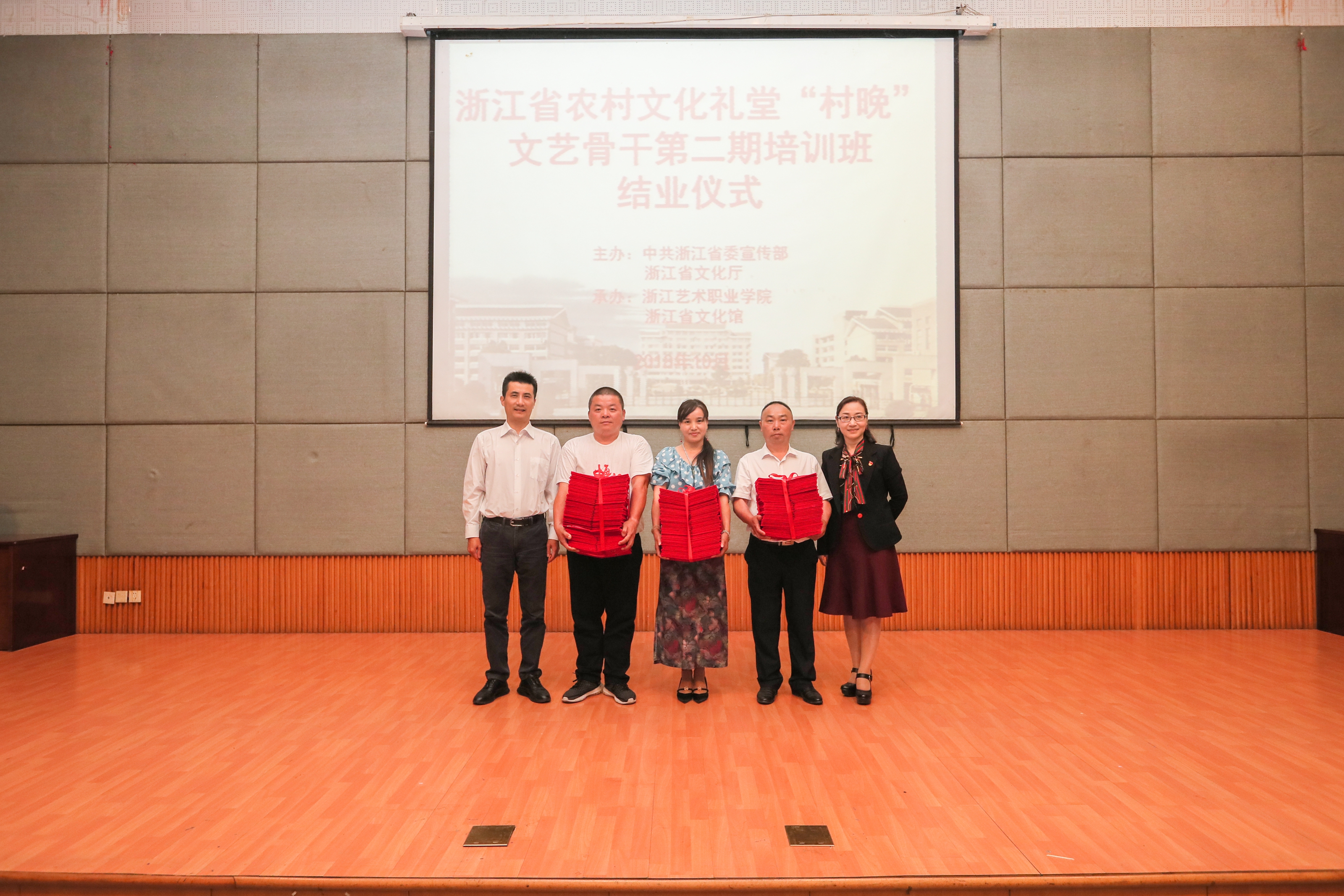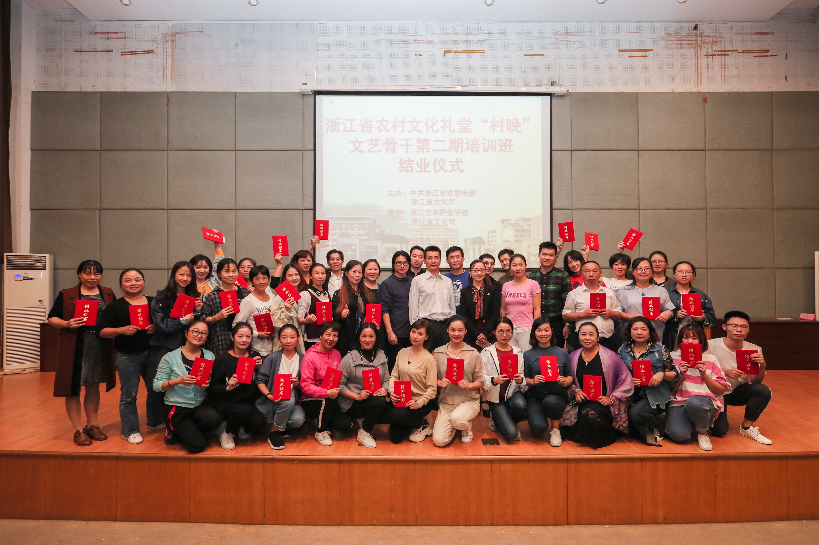 喜庆的舞蹈、可乐的小品、动人的歌曲、精彩的武术……10月11日晚,浙江省第二期农村文化礼堂“村晚”文艺骨干培训班学员成果展示和结业仪式在浙江艺术职业学院(浙江公共文化管理学院)举行,省委宣传部党教处副处长包兴旺、浙艺职院院长黄杭娟在结业仪式上为学员颁发了结业证书。学员自编自导自演的汇报演出透出浓浓的“村晚”味儿,舞蹈《中国进入新时代》、舞蹈杂烩、小品串烧、歌曲串烧《凤凰与山客》 《柴村自古出英雄》《金玉良缘》、武术《精忠报国》、集体排舞《好家风》,精彩纷呈。