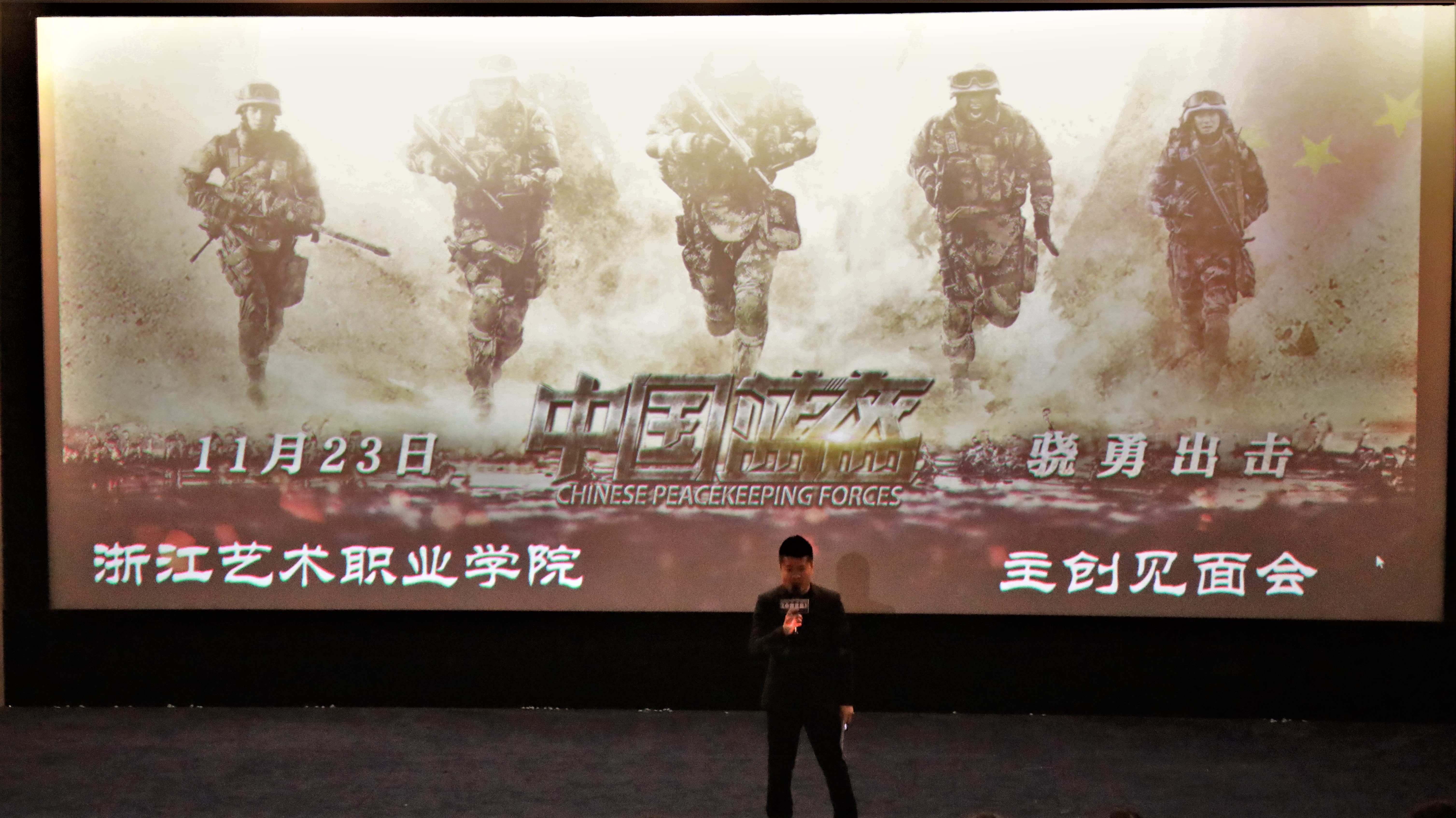 11月19日,电影《中国蓝盔》在我校浙江艺术实验剧场首映,电影导演宁海强携主演徐洪浩、一龙、彭士腾、沈浩、王韬等到场,与现场观影的影视技术系226位同学分享了电影背后中国青年为国出征的故事。