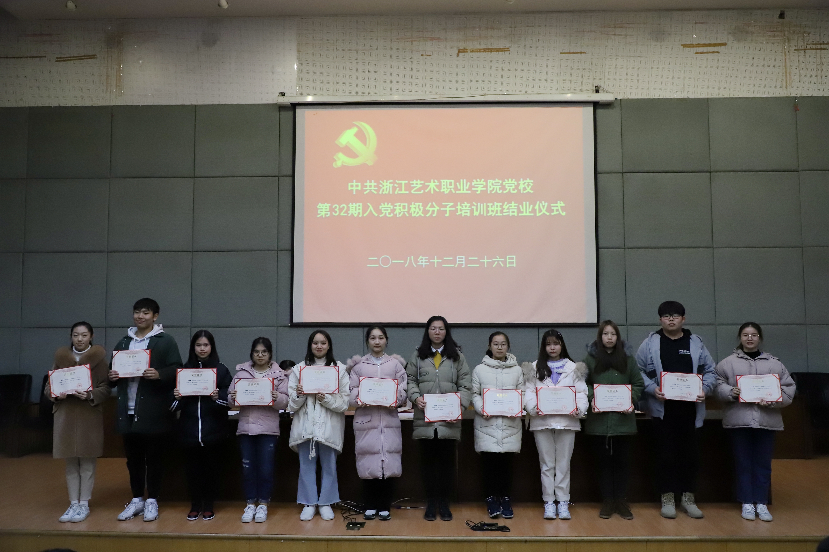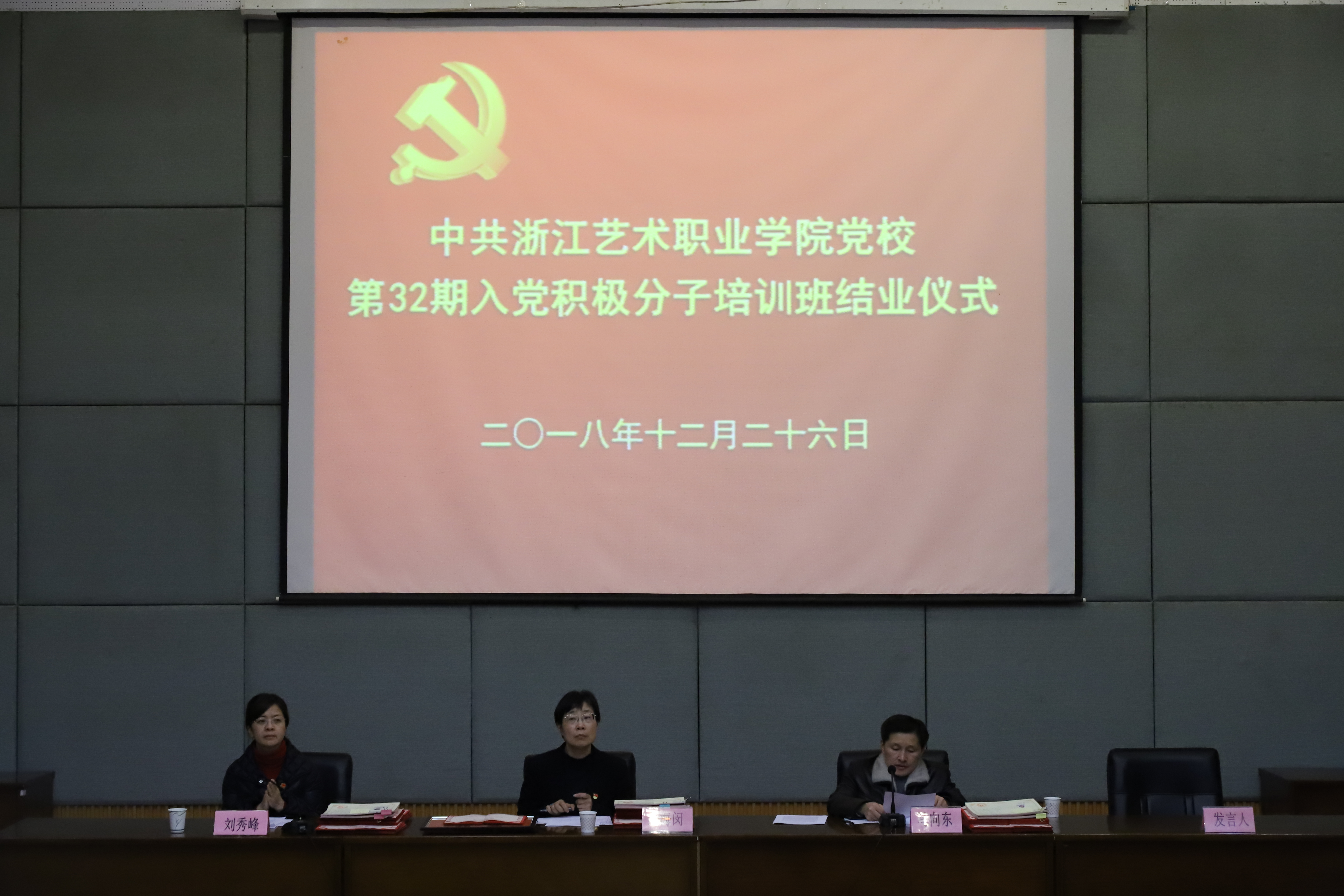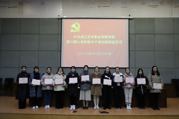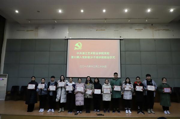 12月26日晚,浙江艺术职业学院党校第32期入党积极分子培训班结业典礼在图书信息中心报告厅举行。党委书记、党校校长朱海闵,党委委员、党委宣传部部长、党校副校长马向东,社会科学部负责人刘秀峰,各系党总支(副)书记、党校任课教师、班主任和本期培训班学员等160多人出席。马向东主持大会。