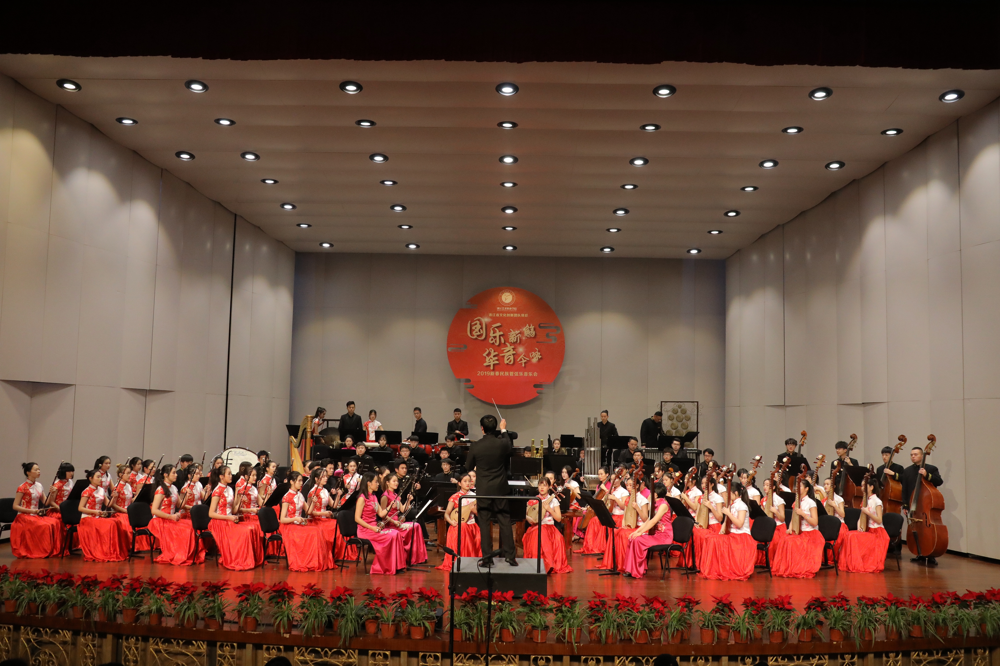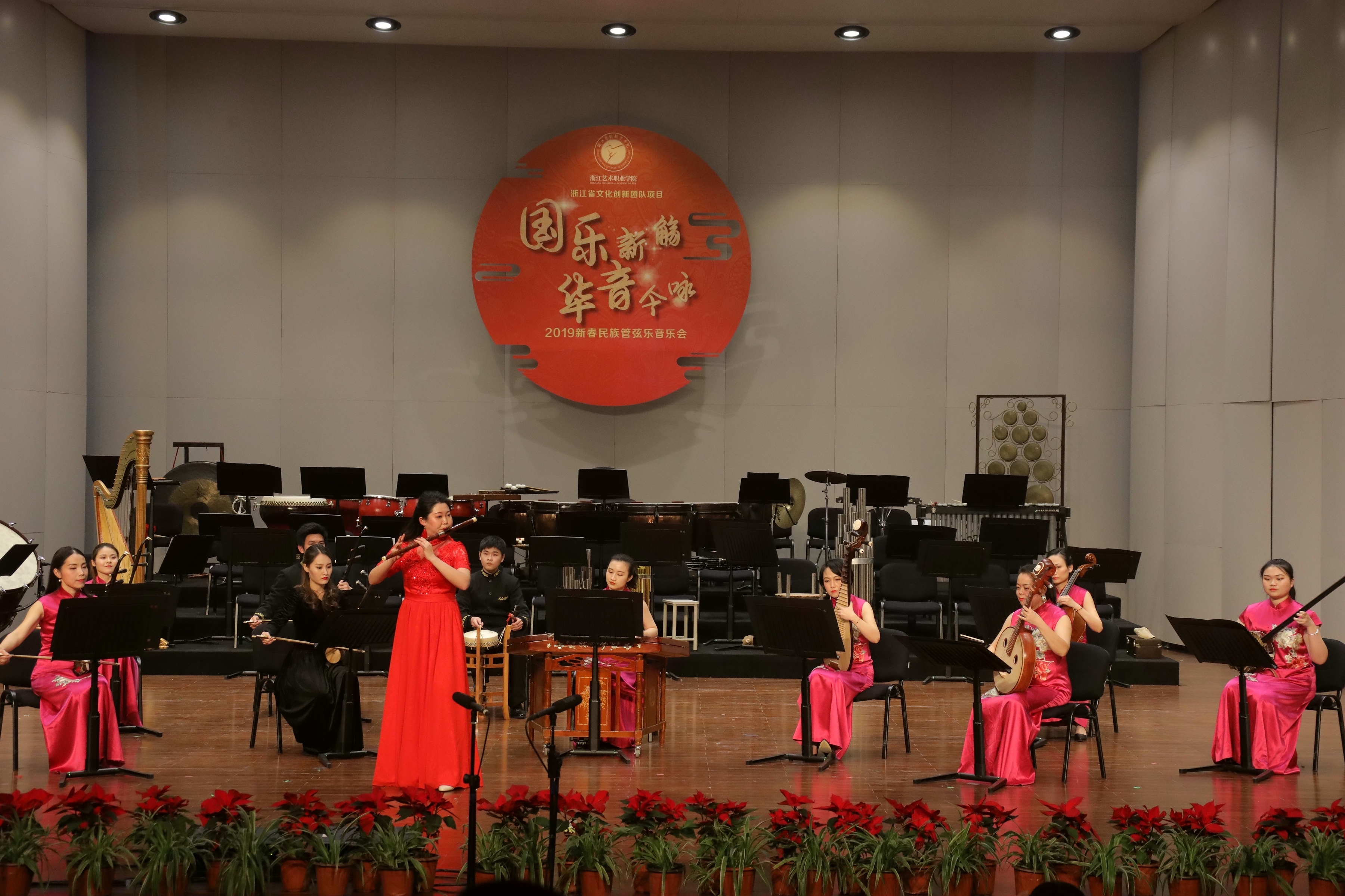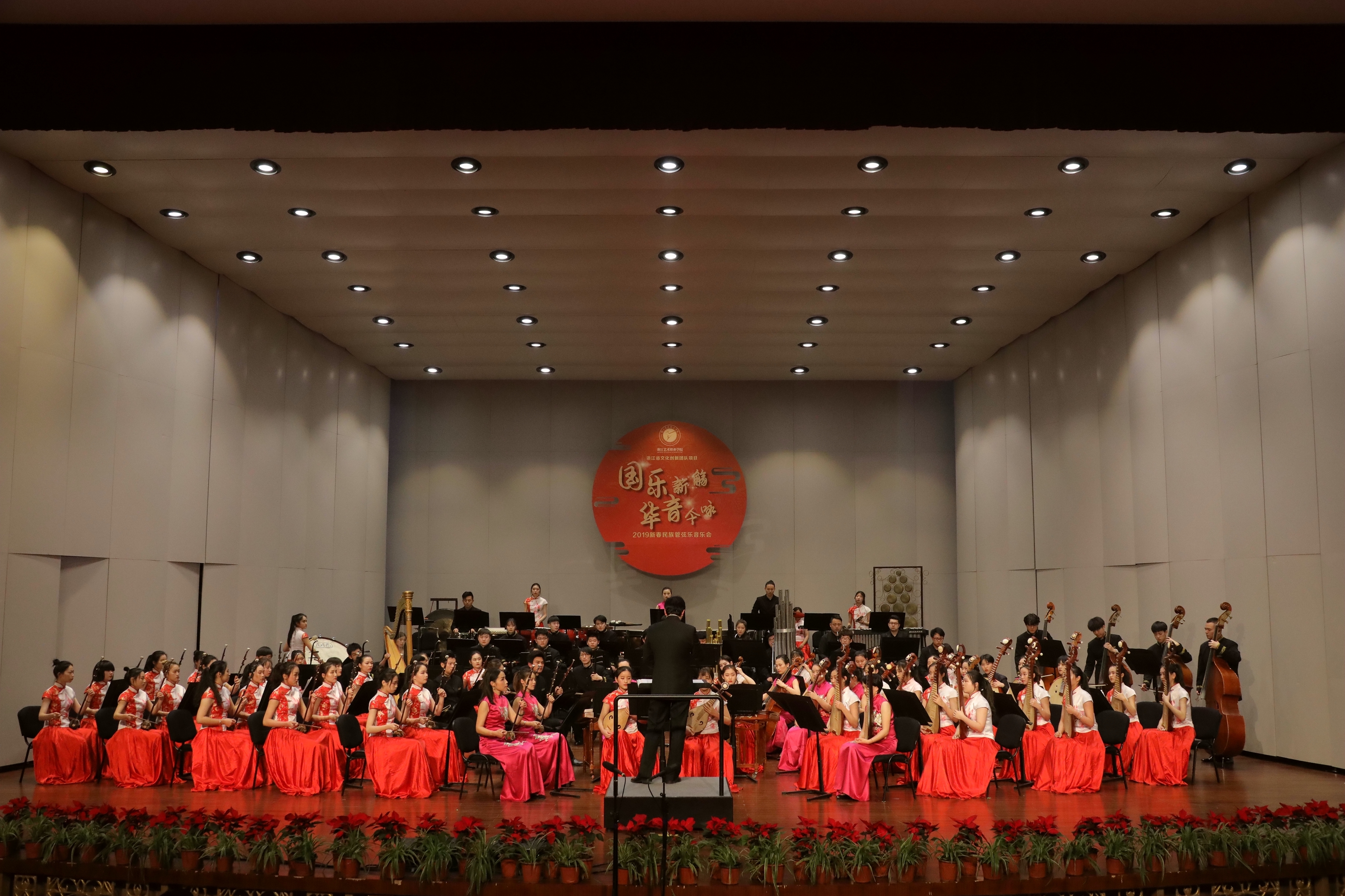 2019踏着欢歌声走来,由浙江省委宣传部、浙江省文化和旅游厅主办的2019浙江省属文艺院团新年演出季,1月8日晚在浙江音乐厅上演了2019新春民族管弦乐音乐会。音乐会由浙江艺术职业学院承办,国乐新觞,华音今咏,感染了现场观众。这是浙江艺术职业学院继10月张凌琵琶独奏音乐会、11月吴樟华竹笛独奏音乐会后,再一次在浙江音乐厅奏响国乐之音。