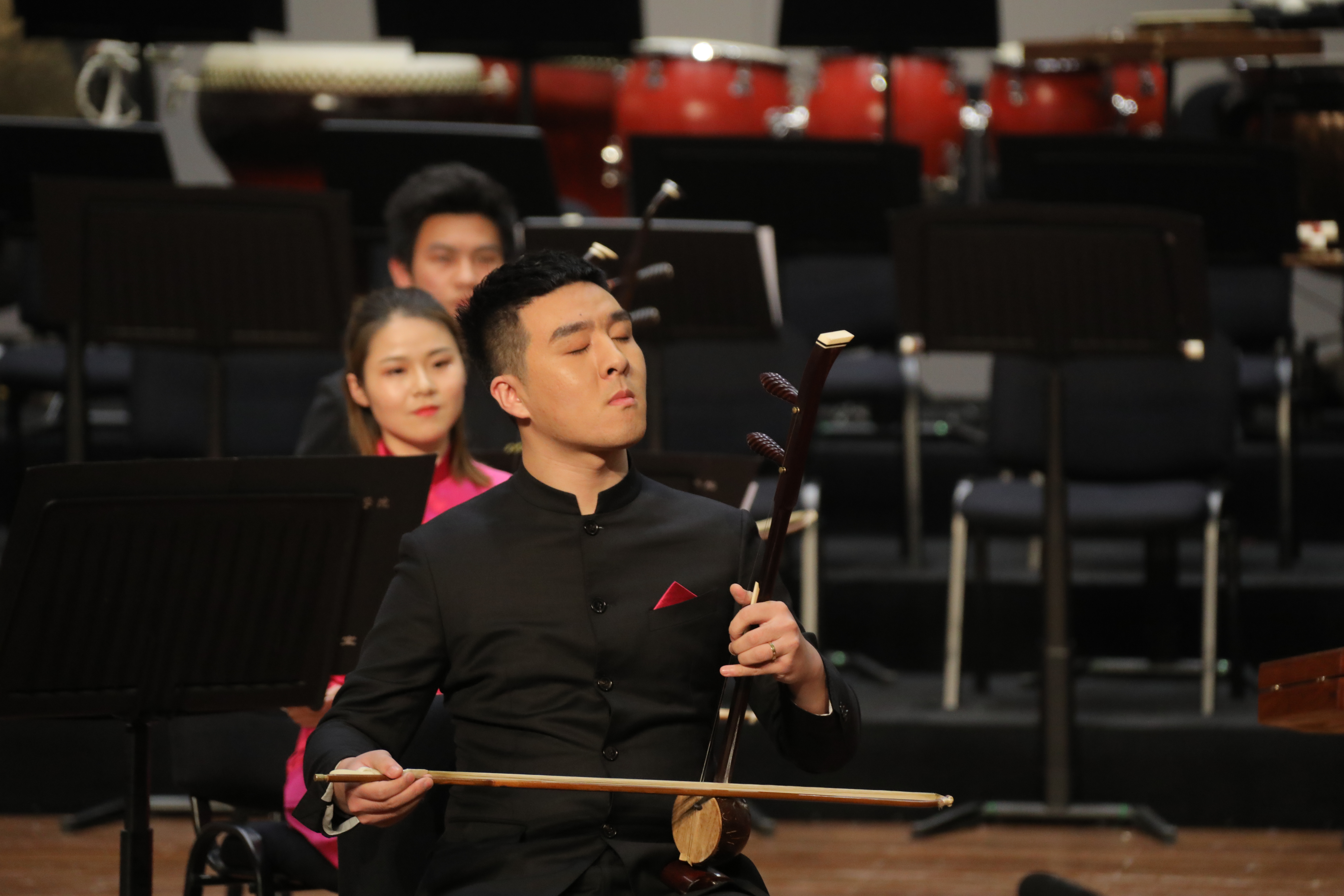 伴随着激情的唢呐和热烈的打击乐,音乐会在压轴曲民族管弦乐《国风》的恢弘气势中进入了尾声。指挥与全体演奏员在舞台上纵情挥洒演绎,音乐厅沉浸在一片欢腾的气氛中。
