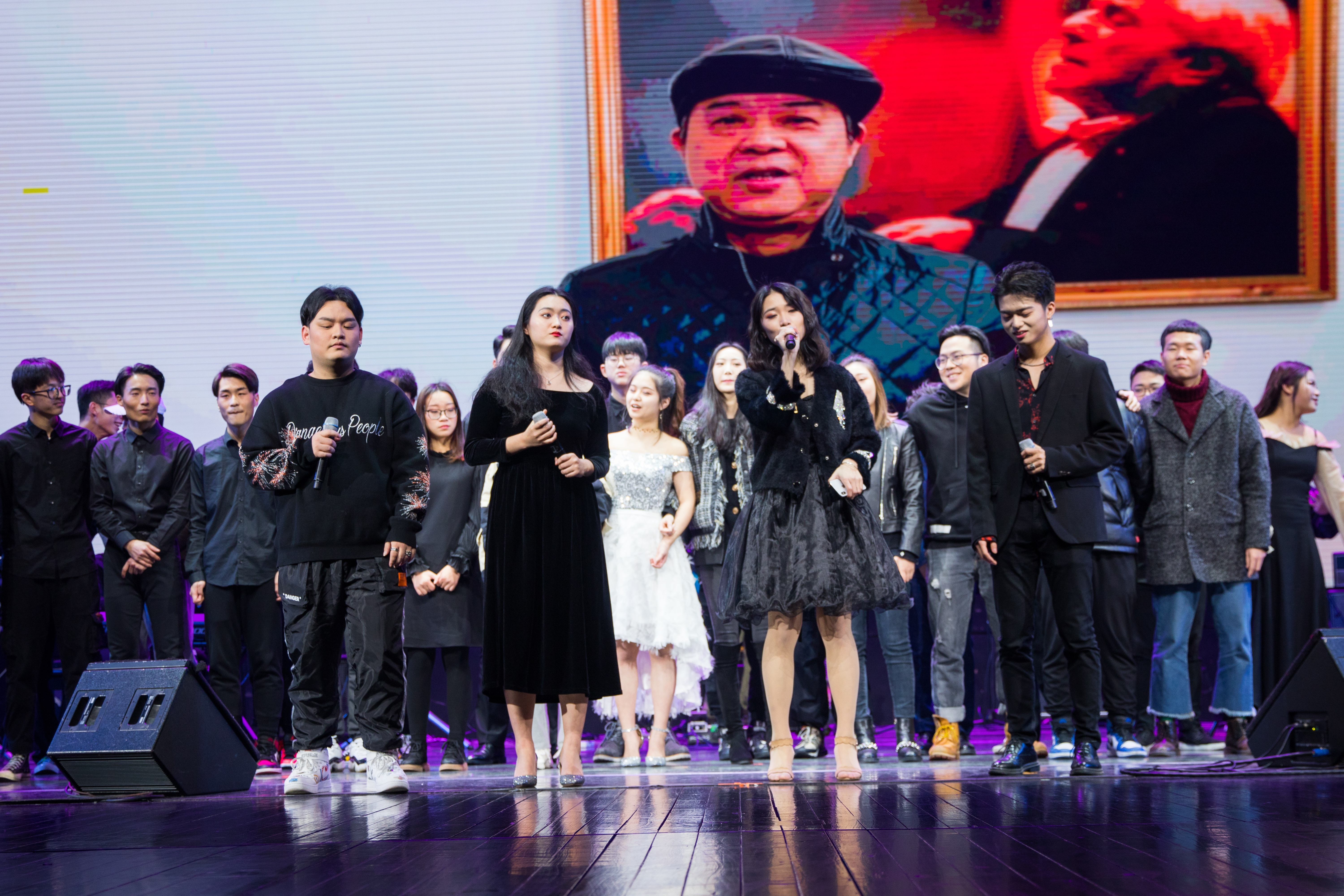 《野百合也有春天》是一首根据华语流行乐坛教父罗大佑所写的同名歌曲改编而成的、兼具人声阿卡贝拉和摇滚乐双重曲风的作品,编曲为16级流行音乐班主任王和,音乐系教师韩紫娟担任歌曲的领唱,在她醇厚富有磁性的声音引领下,ULTRA VOICE人声乐团的6位同学以此起彼伏、错落有致的和音为她伴唱,师生同台献唱的形式吸睛无数,现场气氛瞬间沸腾了起来。