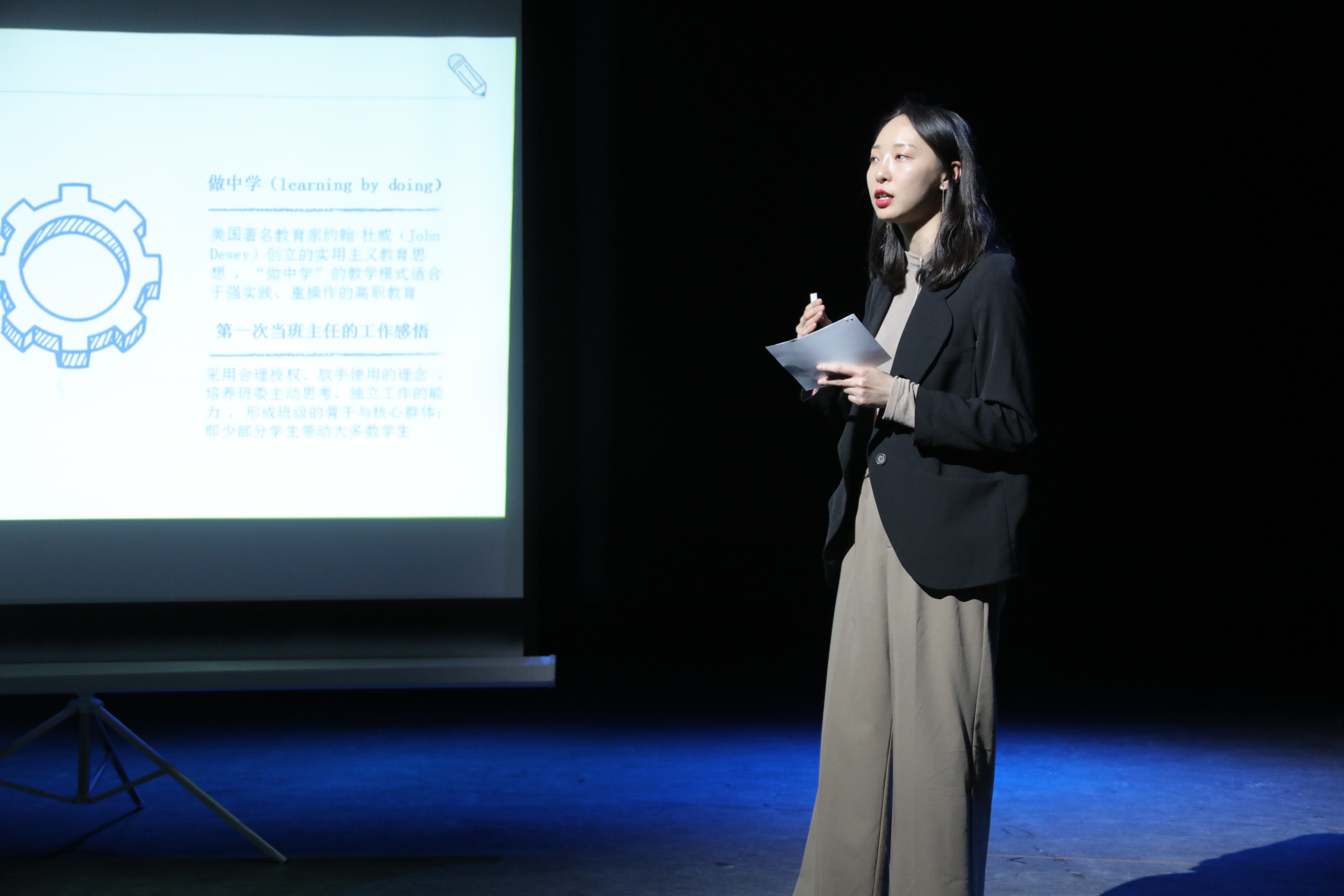 为了彰显助讲培养对象个人能力和专业特点,本次汇报活动的策划及实施,如现场等舞美设计、主持、开场节目、宣传海报和汇报LOGO设计、撰稿等,都是由七名助讲培养对象完成。地点选在小剧场,并且以TED演讲的形式进行汇报,比起在会议室或教室,现场气氛更加轻松、没有距离感。汇报中,7名培养对象图文并茂地陈述了各自的教学思路、目标设计、教材处理等,并进行了客观的教学反思,融入了课程思政等内容,展示了他们通过一年的助讲培养在教学、科研、管理能力上取得的进步。受邀的各位评委对青年教师的演讲进行了专业会诊,大家从青年教师的教案设计、教学进程、课程重点及难点等角度给出了具体的建议,鼓励青年教师扎根学校实际,在工作中时常鞭策自己,不断学习、不断更新,入行之初就要把终身学习当作职业生涯的必修课。