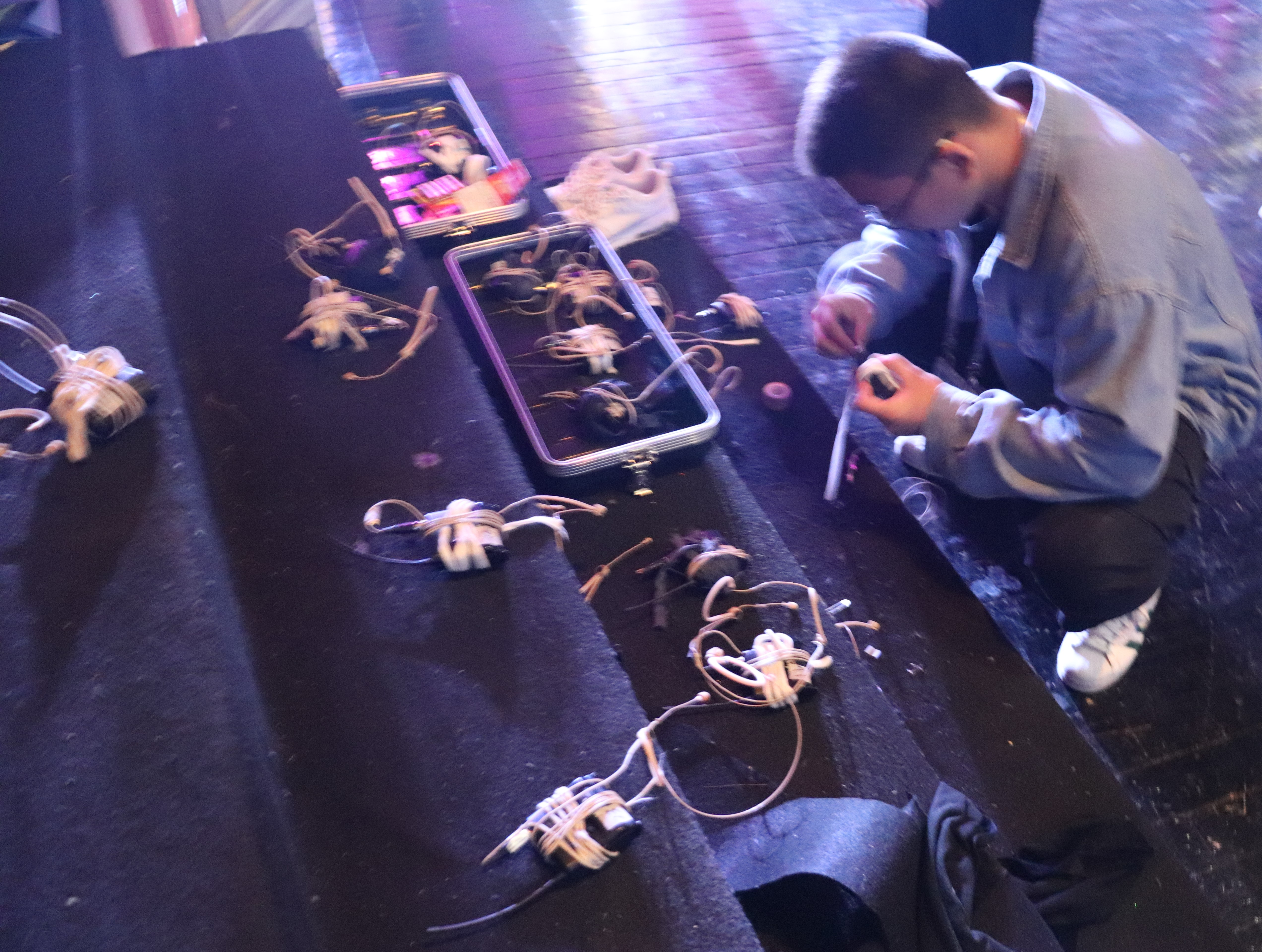 下午至晚上则是细致的走台。在舞台表演中,舞台不是演员一个人的方阵,它还是灯光师的秀场,调音师也在其中不动声色的付出。舞台上光彩夺目的视觉呈现,演员起承转合的唱腔,都离不开一遍又一遍的演练,灯光师的打光跟光以及用光色彩,演员的舞台走位以及佩戴麦的种类都需要具体问题具体分析,一遍遍走过,各部门不断协调尝试,才能呈现舞台最佳视听效果,观众才能最大限度地享用那一场视听盛宴。