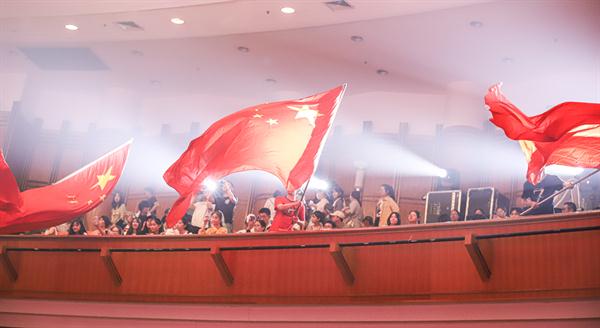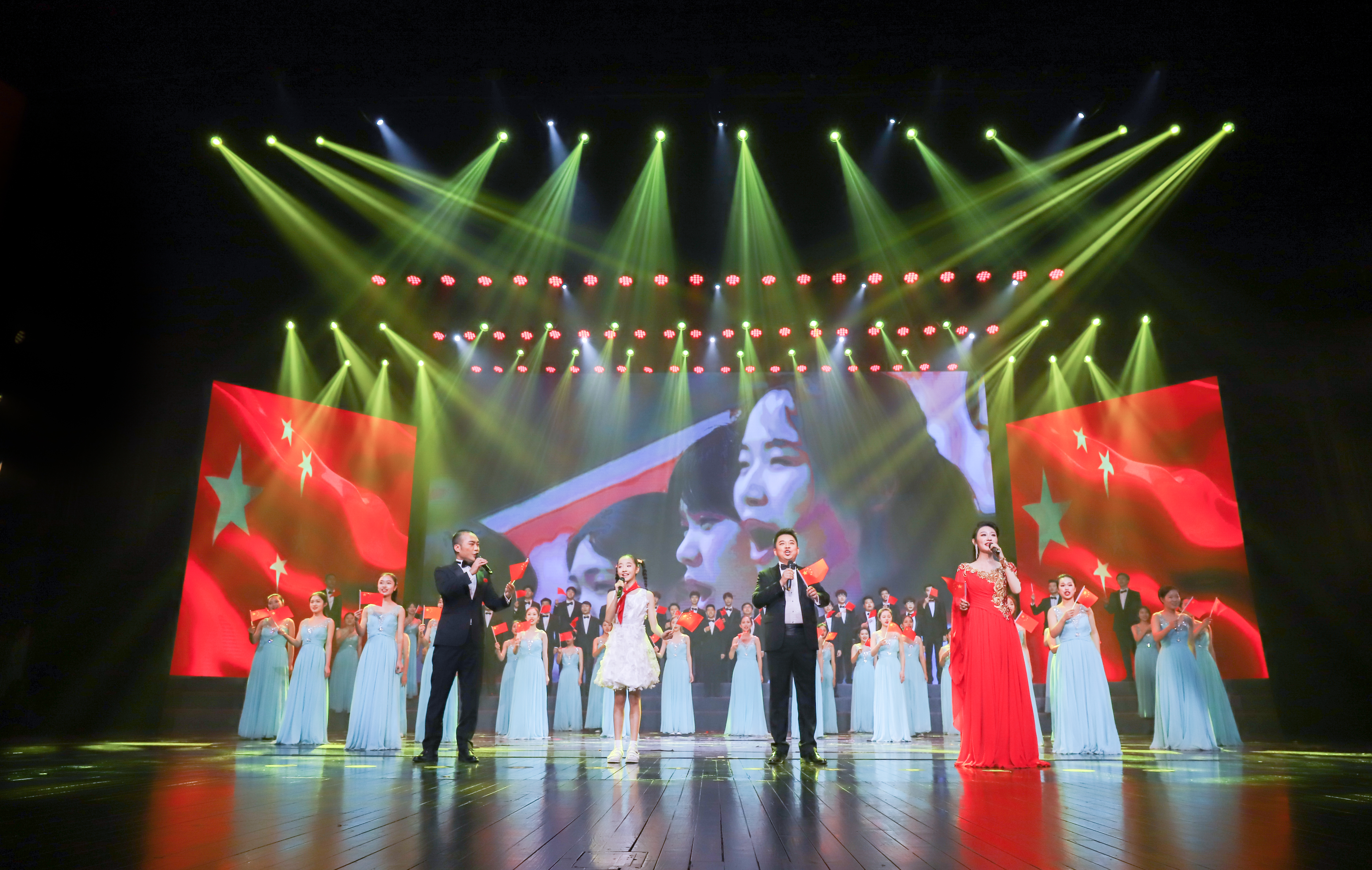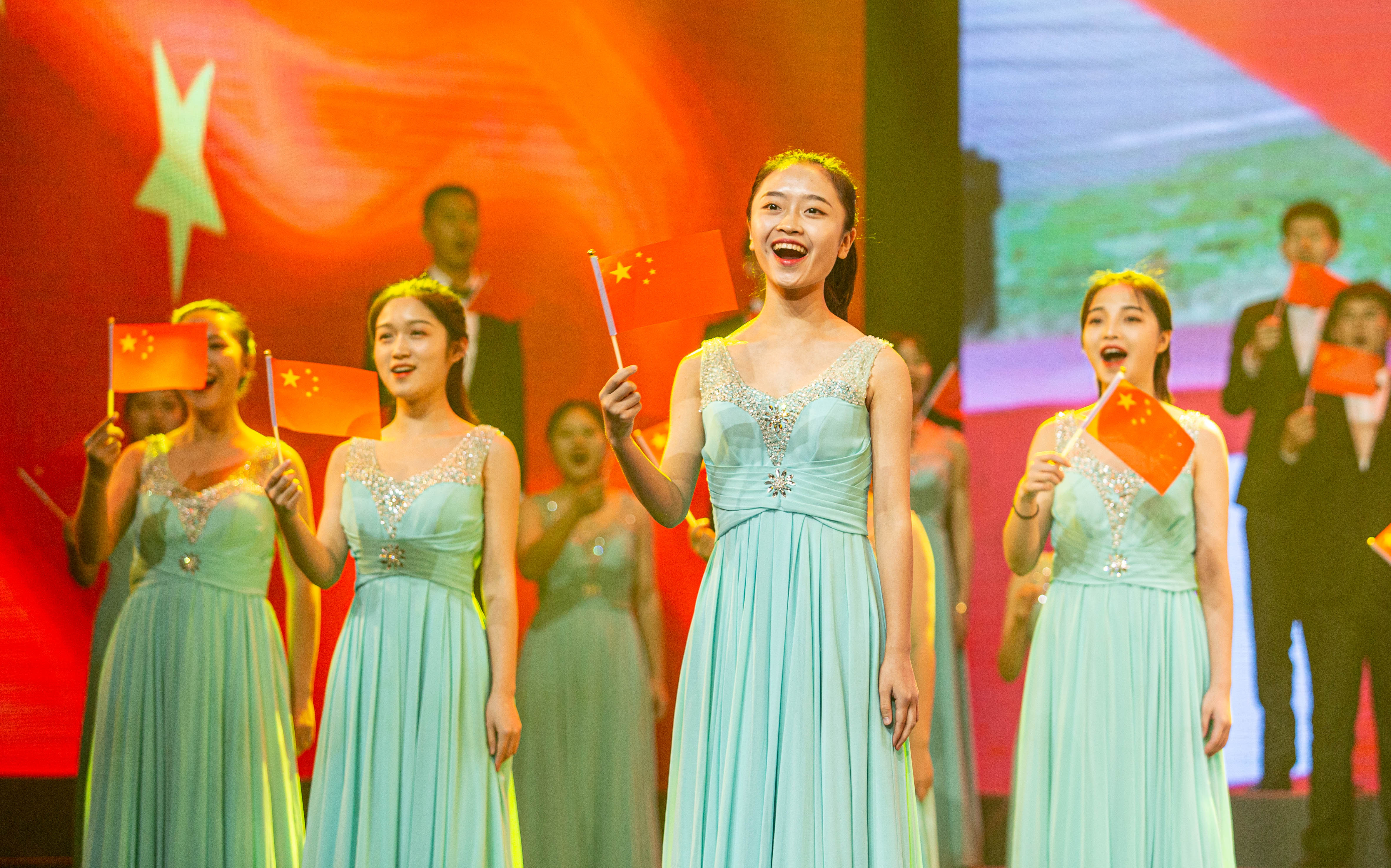 台上演员和观众全体合唱了《歌唱祖国》,国旗挥起来,歌声响彻剧场内外,共同祝祖国生日快乐,祝福祖国越来越好。