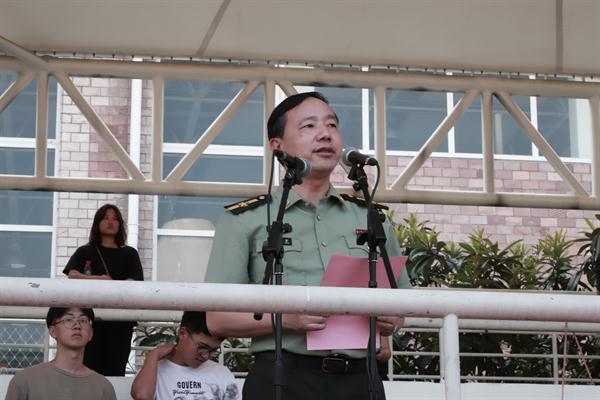 2019级音像班赵景晨作为受训学生代表发言。他讲述了自己两年部队生活的心得体会,并对此次军训做出承诺,服从命令,齐心协力,将小我融入大我,勇于奋斗。