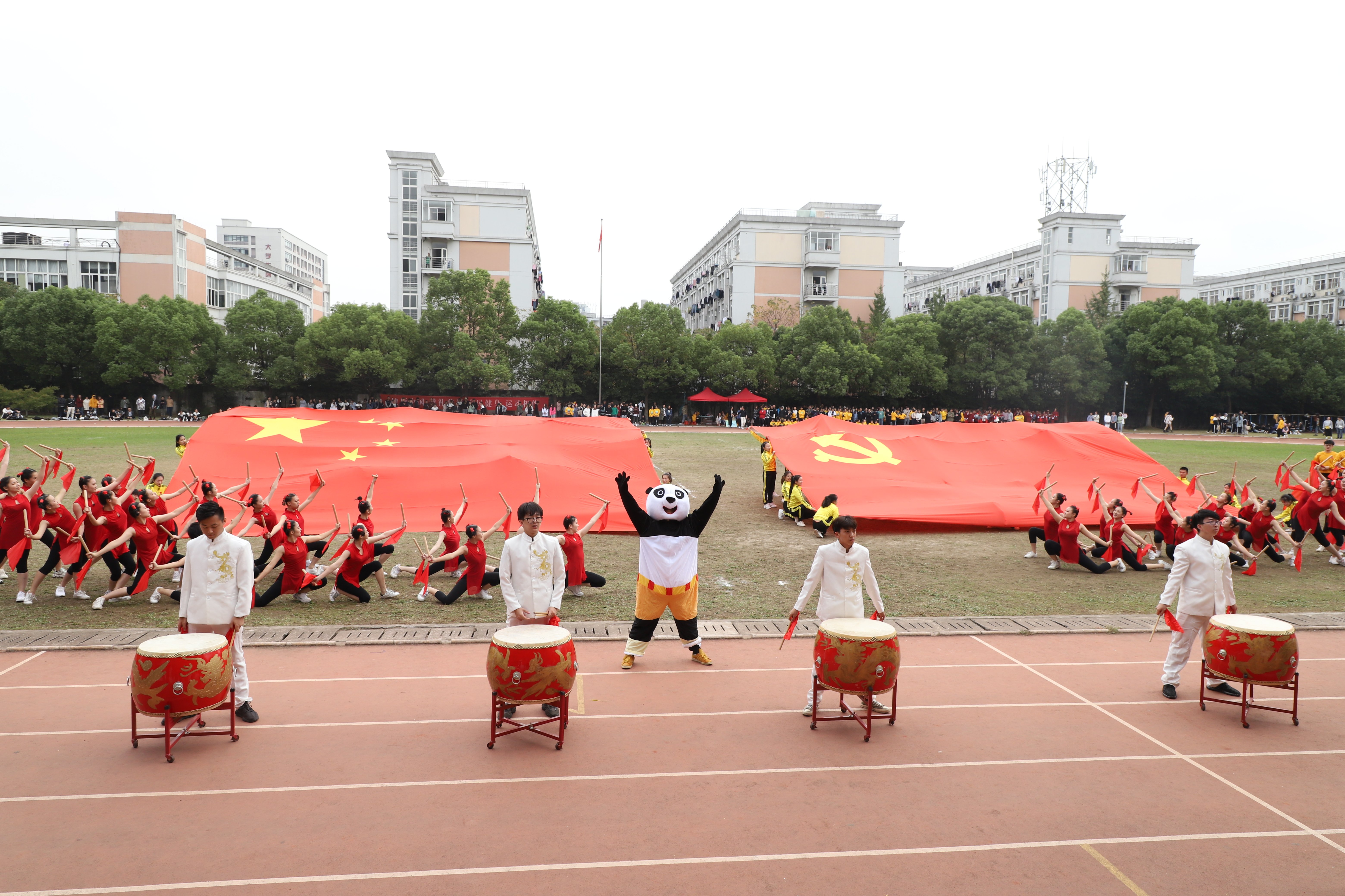 10月17—18日,学校举行了第16届校运动会中,运动会充满了爱国情怀,突显时代主题。如入场式环节,文化管理系展现了“红色梦想”,体现守初心、担使命的时代精神;舞蹈系展示了民族团结、文旅融合;影视技术系表达了争做新时代红色影视追梦人愿望;音乐系通过音乐节拍回顾新中国成立重要节点;美术系致敬中国共产党带领中国人民历经磨难走向新时代;戏剧系展现了浙艺人传承中华优秀传统文化的决心和担当。如团体操环节,各系将新中国成立70周年主题融入团体操编排,通过国旗、红飘带、五角星、向日葵、体操球等元素融入,呈现了一场别样的主题展示。如音乐系团体操《天耀中华》,用声乐、舞蹈、打击乐祝福新中国成立70周年,展现了“不忘初心、牢记使命”的责任担当。舞蹈系以学生技能展示出五角星闪闪发亮,体现浙艺精神代代相传,一颗红心向党走,少年有梦在远方。