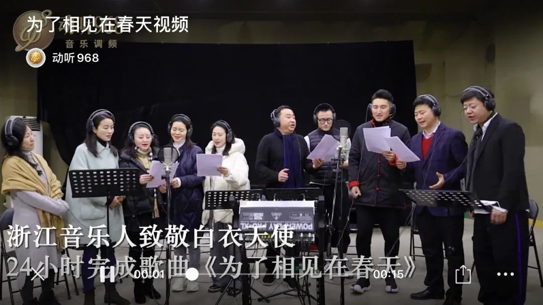 歌声致敬从大年初三启动。浙艺音乐系副教授钱思舒、声乐教师袁春与来自省内高校的音乐教师、歌唱演员一起,争分夺秒地录制了新鲜出炉的抗疫歌曲《为了相见在春天》,作品从谱曲到录制完成不到24个小时。钱思舒还与浙艺校友陈韬录制了男女声对唱《燃着爱》,以歌声向战斗在抗击病毒第一线的广大医务工作者致敬。居家防护期间,钱思舒又录制了《待到山花烂漫时》《希望》《最美的人》。在家里录制很困难,工序复杂,关在更衣室里保持密封隔音,不允许有一点杂音和喷口音,反反复复录制,多个手机操作系统,一句句剪辑录制,最后挑选出最好的声音,在密闭空间常常一待就是三四个小时。袁春录制的歌曲《我看见,杭州》,是一首为杭州抗疫阻击战即时创作的歌曲,唱出了杭州以坚定信念迎接风暴的坚强和温暖的人文关怀,用歌声为抗疫勇士传递力量和信心,为杭州助力加油。