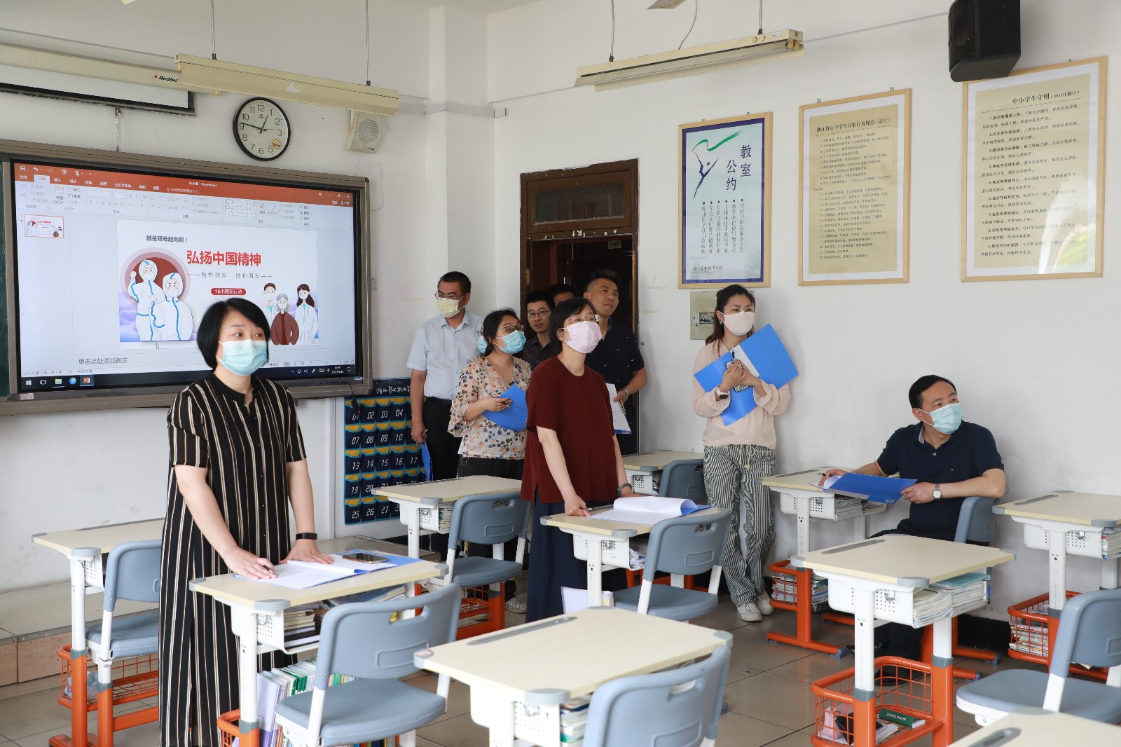5月18日,校党委书记朱海闵、党委副书记夏开堂、副院长沈军甫、支涛、党委委员、宣传部部长马向东,各系部书记、职能部门负责人对参赛的16个班级教室进行打分。评比现场,学生们当起讲解员向评委们介绍板报主题、墙面设计,学生们还展示了疫情主题专业节目。