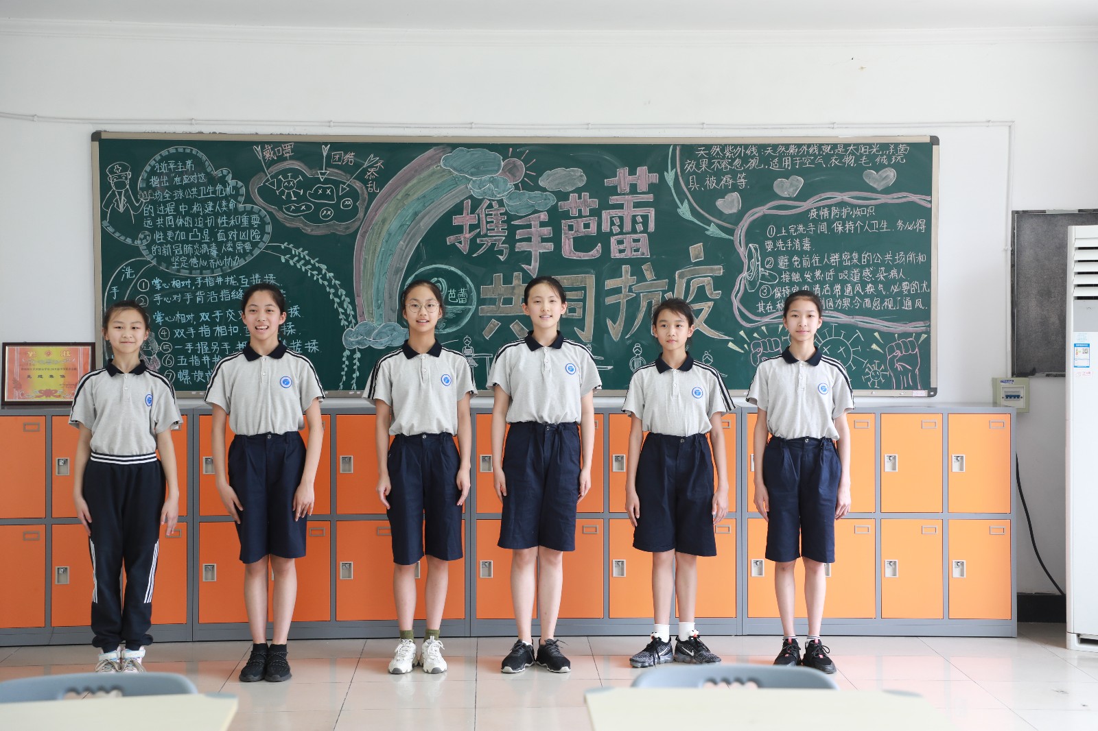 在墙面美化中,同学们发挥奇思妙想,把教室墙面装饰得丰富多彩。手绘抗疫海报、班级防疫流程图和预防新冠病毒知识宣传板,琳琅满目,还有的班级在墙上做了一个角落,名为“我们都是收信人”,上面贴满了同学们读了习总书记给北京大学援鄂医疗队全体“90后”党员的回信之后的感悟。