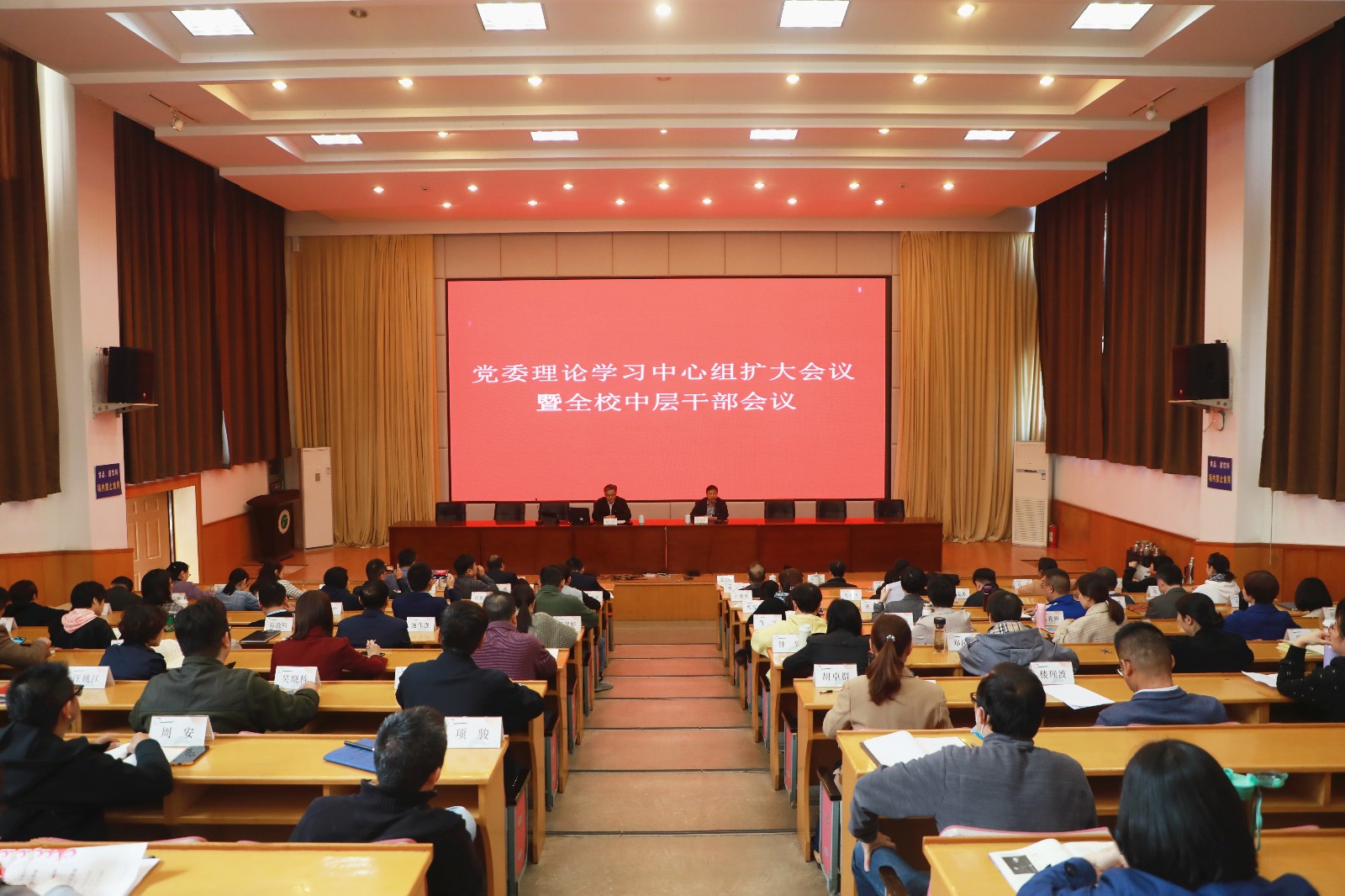 11月4日下午,校党委理论学习中心组学习(扩大)会议暨全校干部大会在图信中心报告厅举行。会议专题学习了党的十九届五中全会精神,分析当前国内外形势,部署学校四季度重点工作。校党委领导班子成员薛亮、夏开堂、章轲、徐芳、沈军甫、马向东,全体科处级以上中层干部、各党总支委员、各支部书记、各部门党务干部、思政理论教师参加会议。党委副书记夏开堂主持会议。