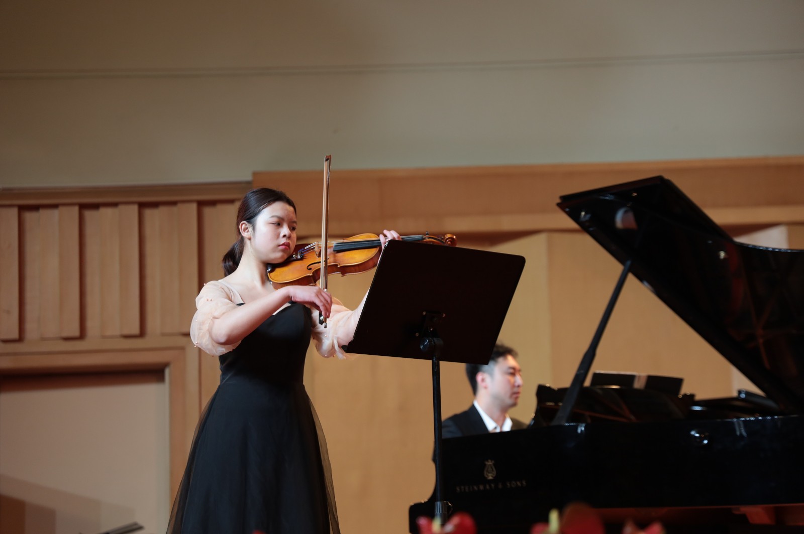 钢琴与小提琴合奏曲《组曲为两把小提琴与钢琴而作》演奏中,两位小提琴手与钢琴手的默契配合,使两种琴音融洽地交织在一起,让听众们深刻地感受到莫什科夫斯基风格的异国情调。