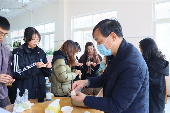 活动中,薛亮与同学们交流了中华各民族关于“年”的习俗,黄杭娟耐心地教同学们如何包饺子,夏开堂细致地询问起同学们在浙艺的学习生活,师生聚在浙艺,其乐融融。