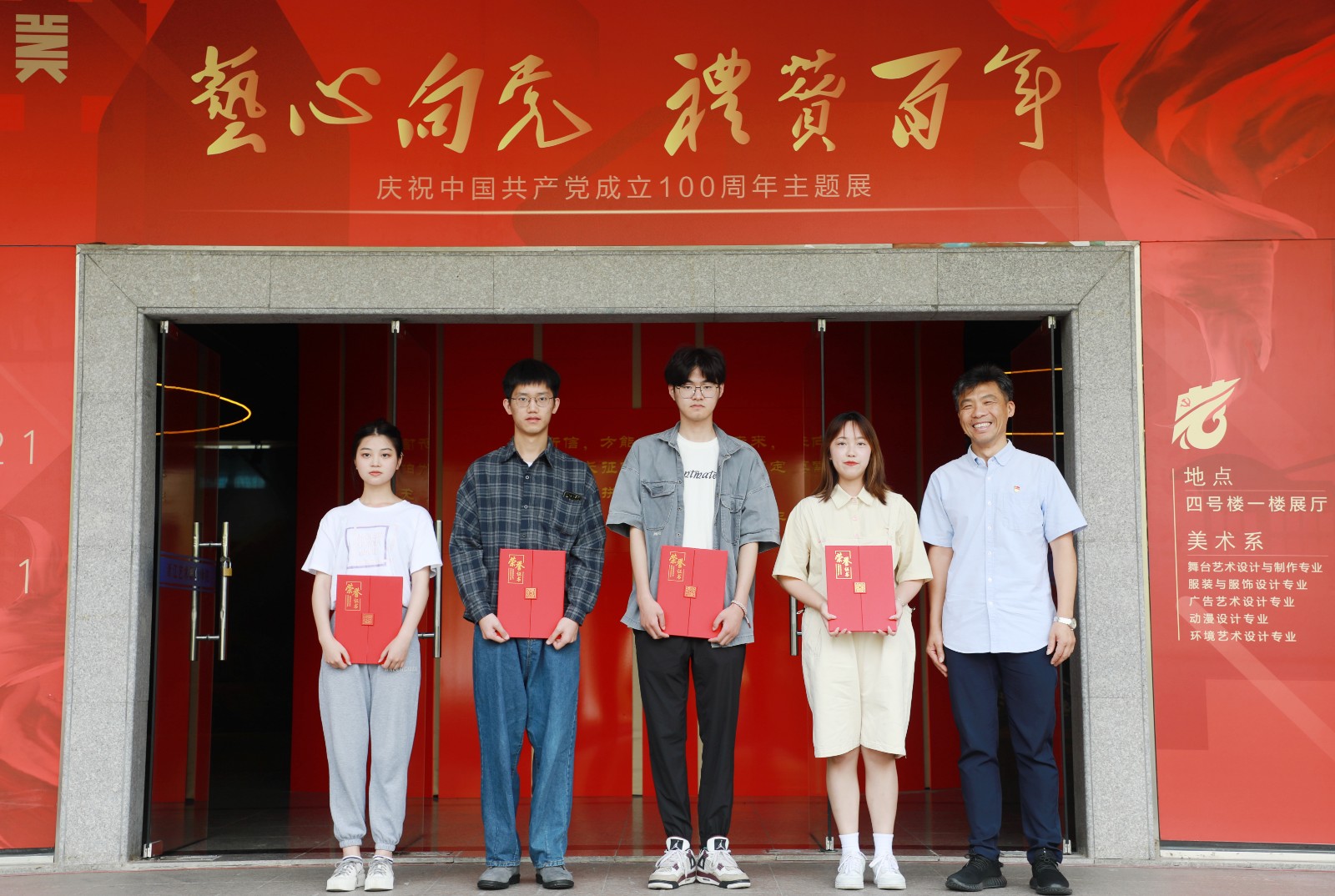活动前期,学校开展百名师生党员“百人百言致敬百年”接力活动和书法作品致敬百年征集活动。美术系党总支下设的三个党支部和五个教研室结合专业特色,将党史学习教育融入专业教学,完成了前期的设计、创作、布展工作。