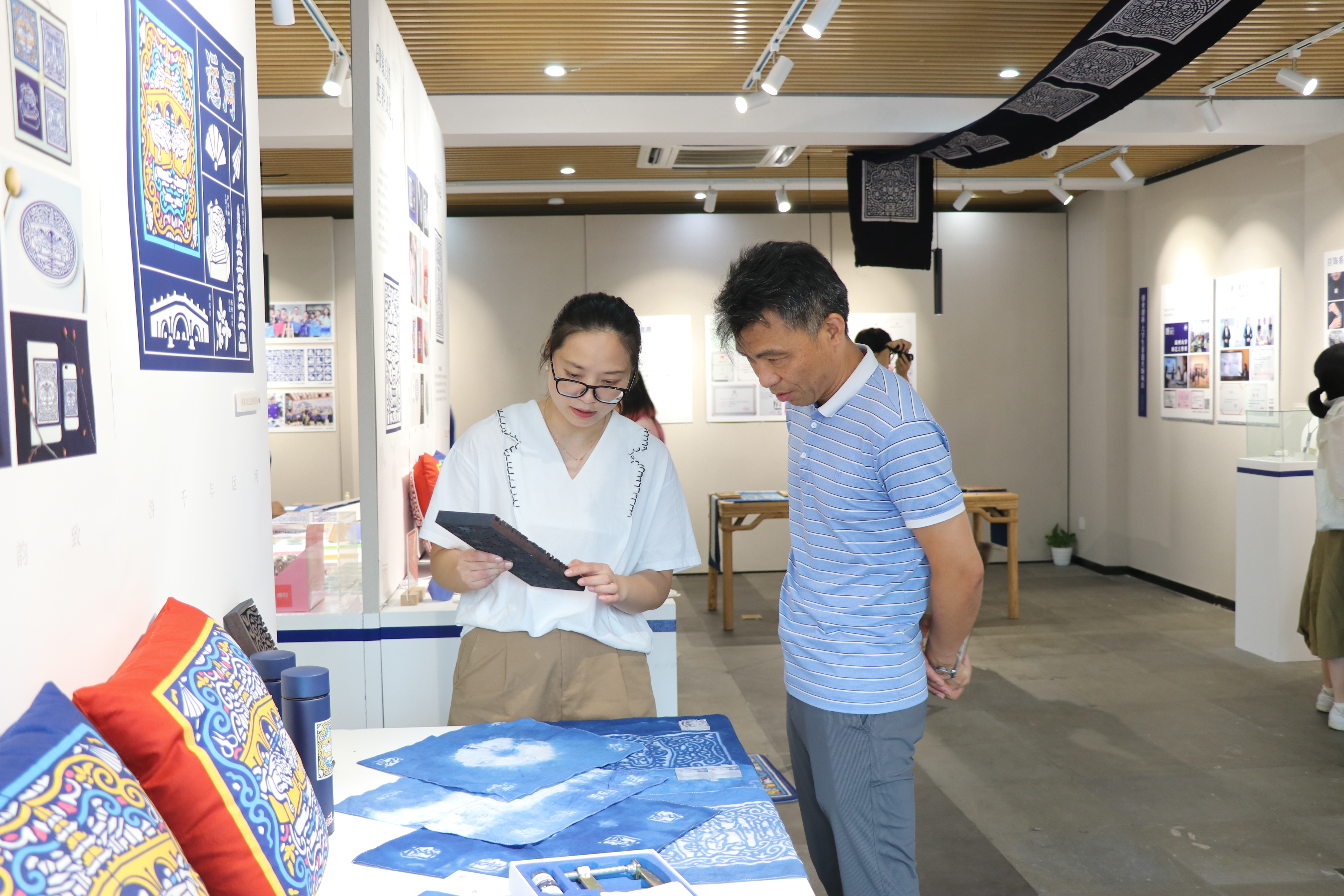 本次展览由非遗蓝夹缬技艺传承人——叶其丹带来夹缬历史渊源和技艺流程,以及与浙江艺术职业学院手工艺学院教学实践融合的作品。