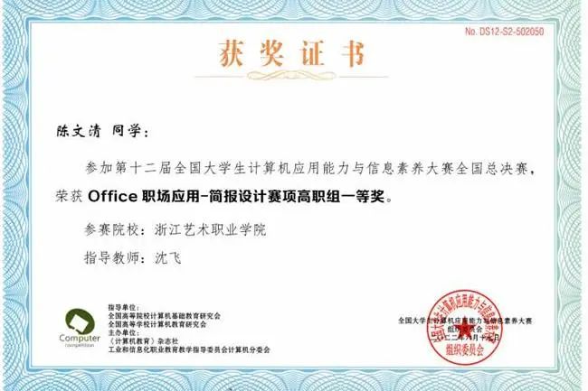 近日,第十二届全国大学生计算机应用能力与信息素养大赛圆满结束。经过激烈角逐,浙江艺术职业学院选手在比赛中表现出色,2021级学前教育三班学生陈文清和求吕蓥双双获得高职组office简报设计赛项一等奖,我校获得了团体二等奖。这是我校第6次参加全国大学生计算机赛事,在浙江省参赛高职院校中平均成绩最高。