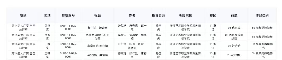 近日,第14届全国大学生广告艺术大赛落下帷幕,浙江艺术职业学院戏剧影视学院11位学生在专任教师孙国虎的指导下,荣获第14届全国大学生广告艺术大赛三等奖2项,优秀奖2项。