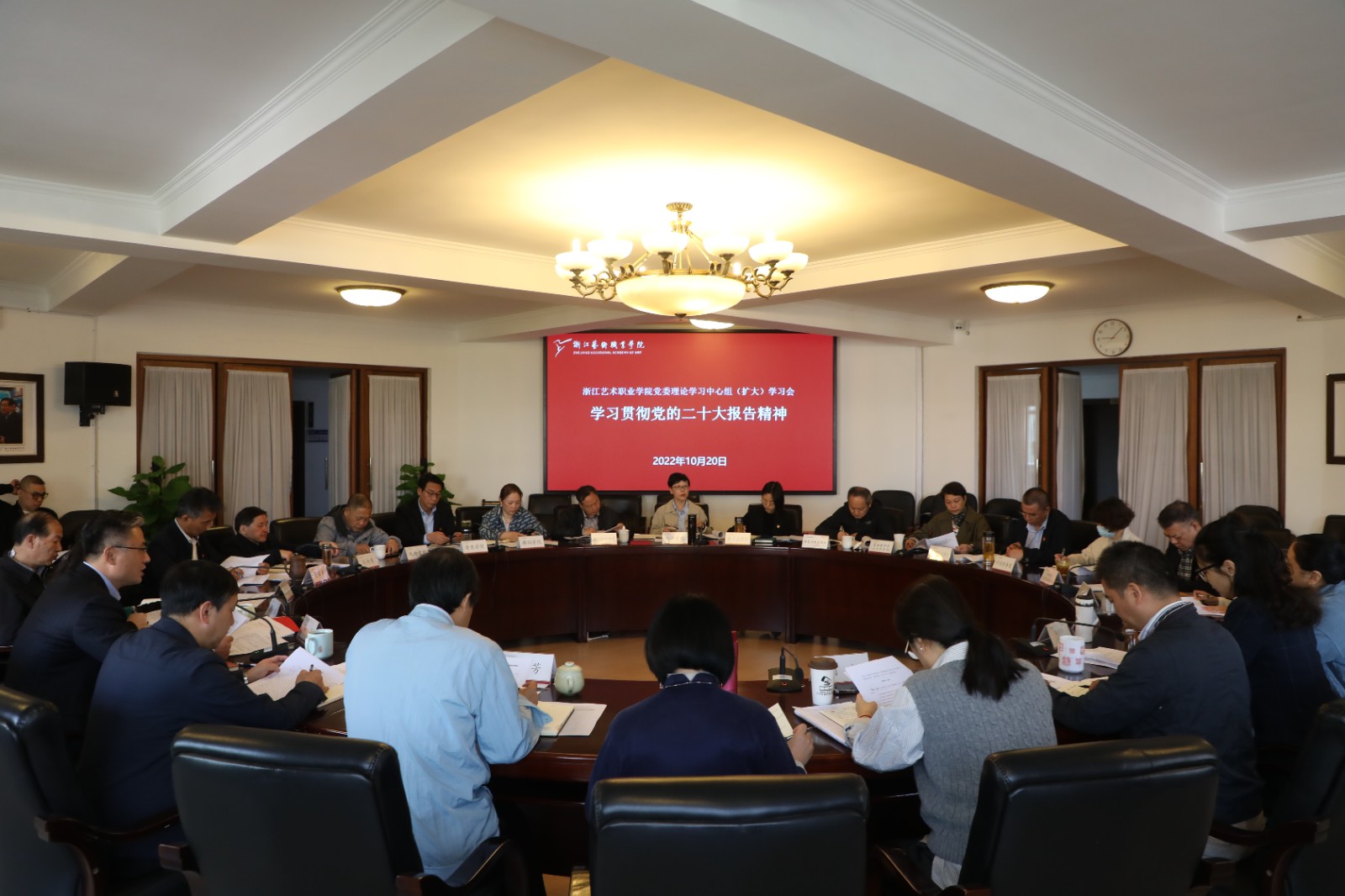 10月20日上午,浙江艺术职业学院党委理论学习中心组召开扩大学习会,专题学习党的二十大报告精神。校党委书记薛亮主持会议并讲话。校党委班子成员参加学习会并作交流发言,各二级学院党政负责人、职能教辅部门负责人列席学习会。