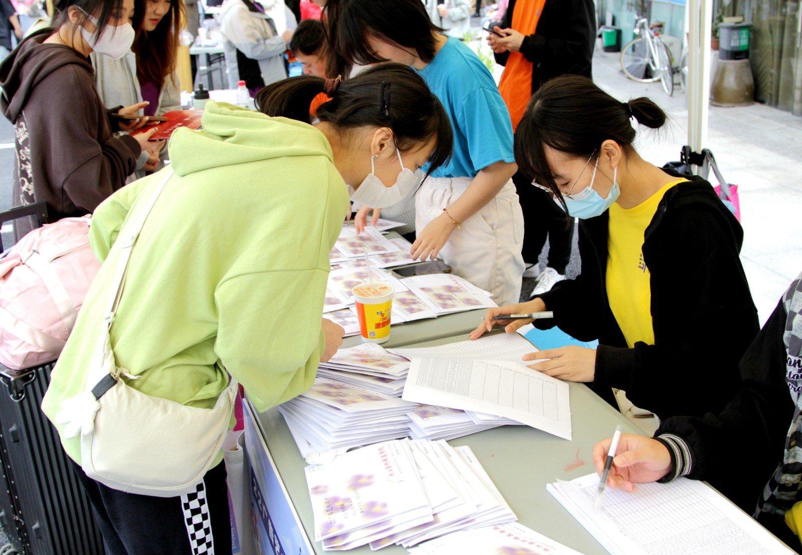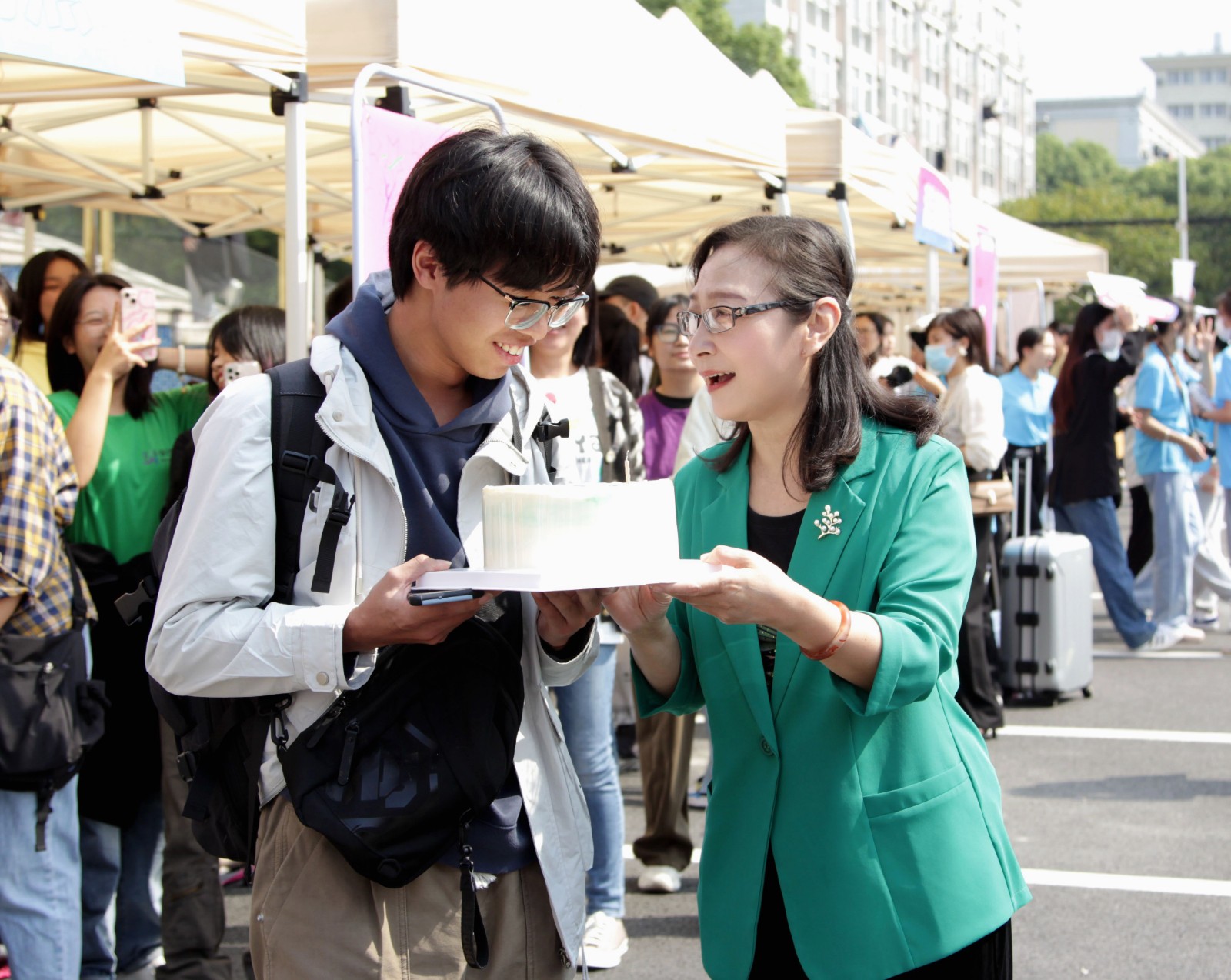 浙江实验艺术剧场广场上非常热闹,播放校歌、志愿者引导、搬运行李……报到气氛热烈。领取新生大礼包、验证录取通知书、户口办理、学平险办理……各二级学院都设置了报到点和行李寄存点,为新生提供相应服务。