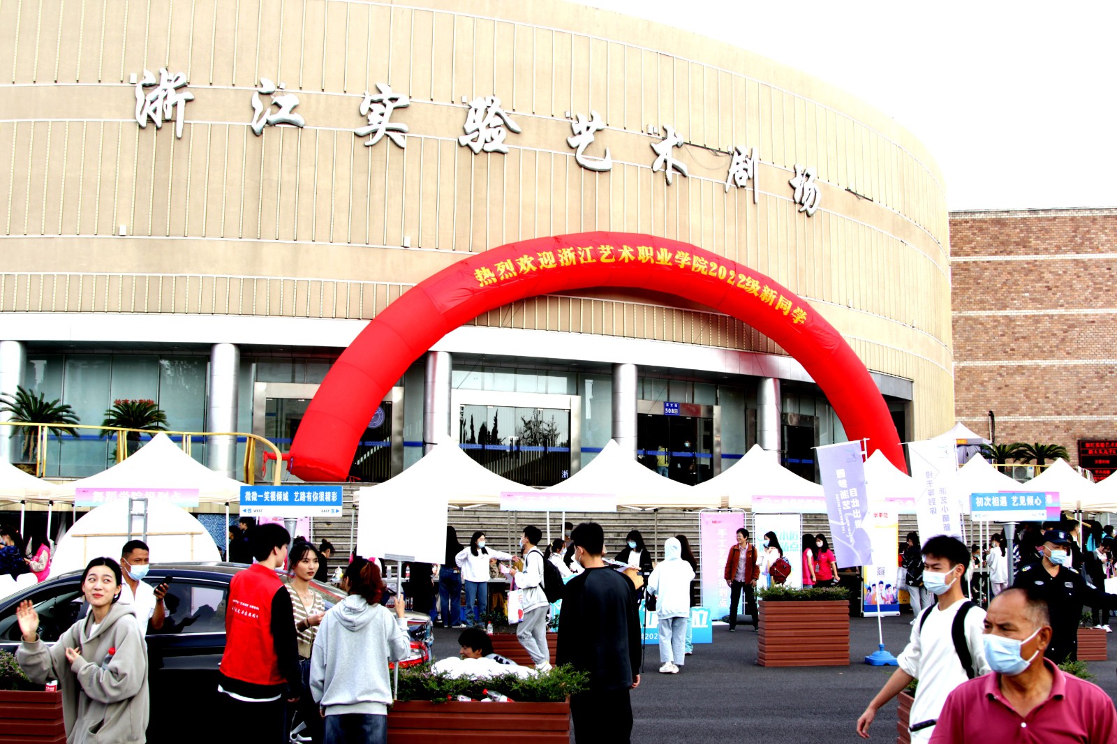 10月15日上午,阳光明媚,2022级高职和专升本新生陆续来到浙江实验艺术剧场广场报到。今年录取高职新生有1515名,其中乡镇文化员定向培养班新生中有数位高考分数达到600分以上。此外与绍兴文理学院、浙江音乐学院联合培养专升本班学生53名,与金华艺术学校、绍兴艺术学校五年制转段升学新生90人。