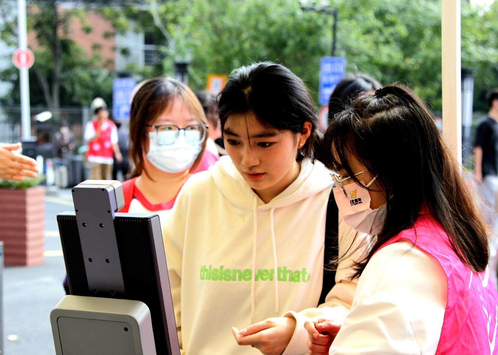 志愿者是报到现场的一道亮丽风景线,搬运行李,指引道路,扫码测温,为新生拍照,现场唱歌营造气氛,志愿者们不仅为新生提供全方位服务,而且多才多艺,让新生们开开心心报到。行李存放处、摆渡车旁随处可见志愿者的身影,志愿者的给力让报到工作有条不紊地进行。