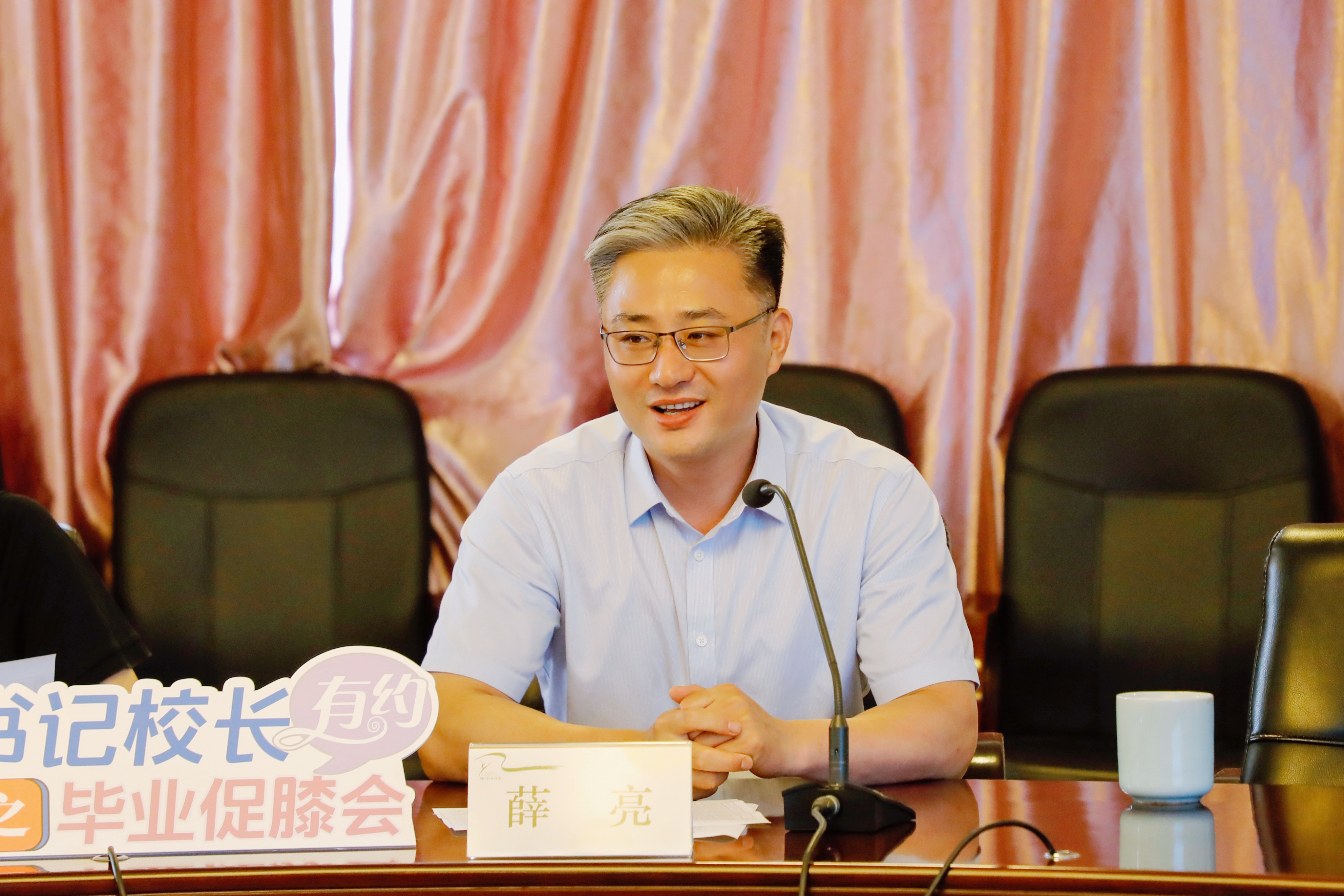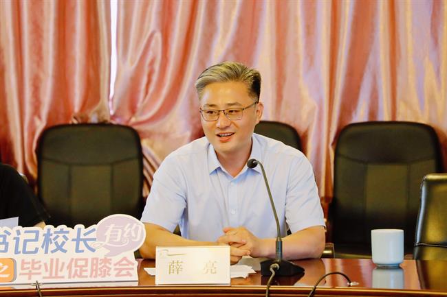 薛亮感谢毕业生代表们对学校提出的意见和建议。他与同学们分享了自己的毕业求职故事,激励同学们在未来的人生道路上满怀热诚,在广阔的天地挥洒青春的汗水。希望同学们在70周年校庆之际带着更高的荣誉回母校,共同分享成功的喜悦。