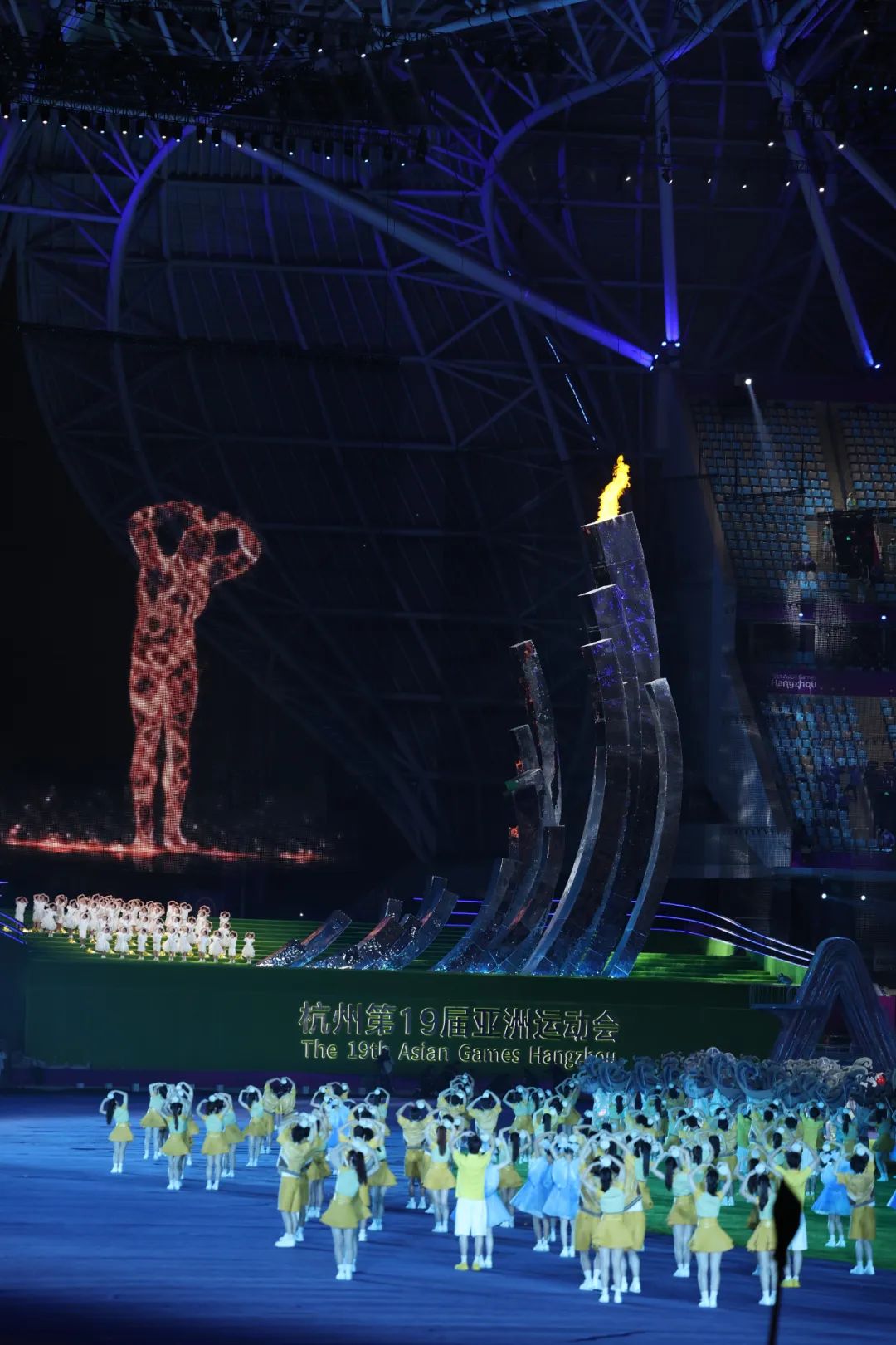 在火炬熄灭环节中,戏剧影视学院、音乐学院、演艺与教育学院学生在正对主席台主表演区核心区域进行歌舞表演,与数字火炬人“弄潮儿”一起带动现场观众对着火炬比心,见证亚运会火炬塔的熄灭。