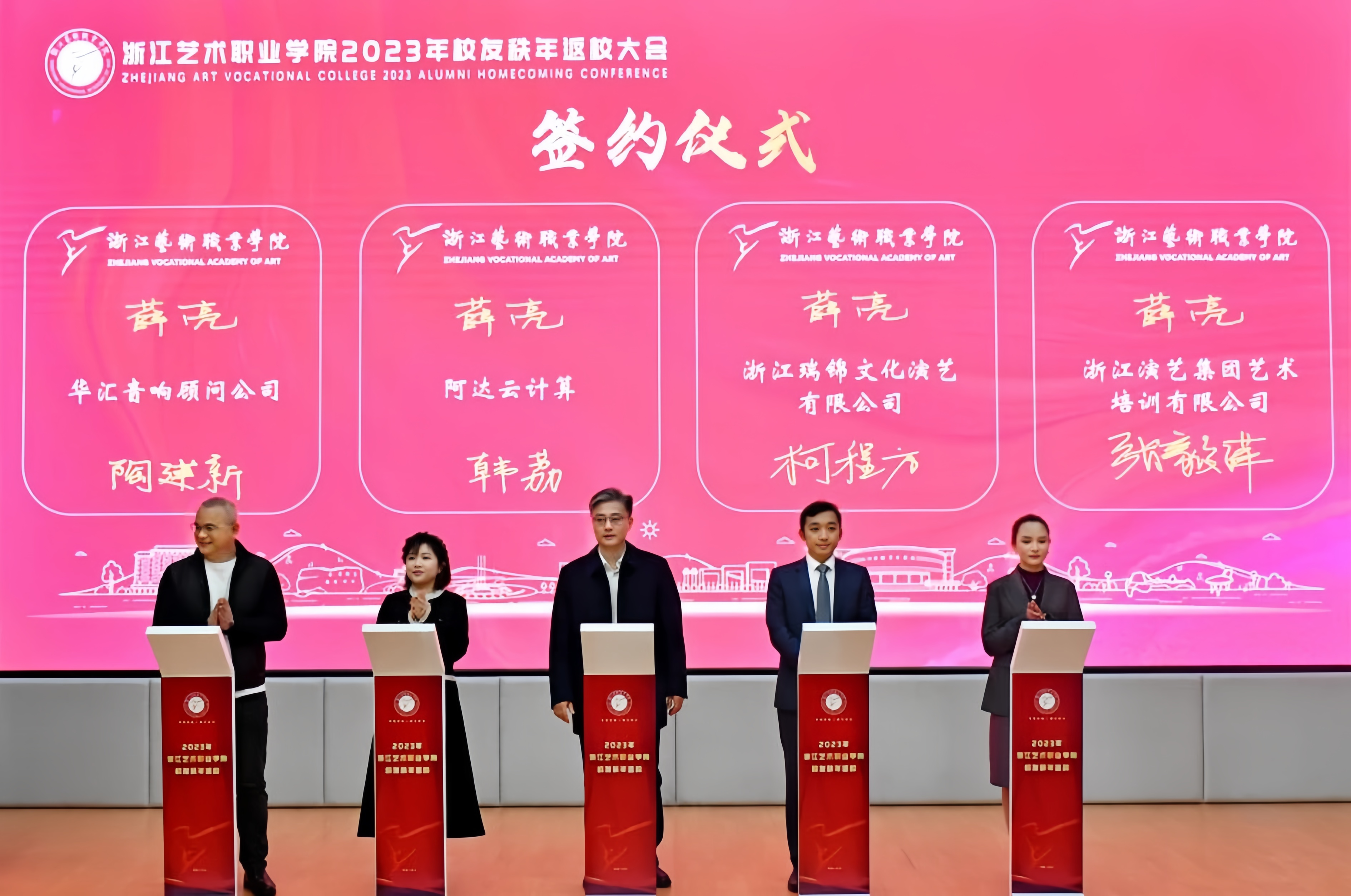 校友企业代表柯程方为母校送上祝福,对学校开拓校友企业产学合作专项通道表示感谢。华汇音响顾问公司、阿达云计算、浙江瑞锦文化演艺有限公司、浙江演艺集团艺术培训有限公司四家校友企业签约成为学校首批“校友企业产学合作协同育人基地”。薛亮为校友企业代表陶建新、韩荔、柯程方、张毅萍授牌。